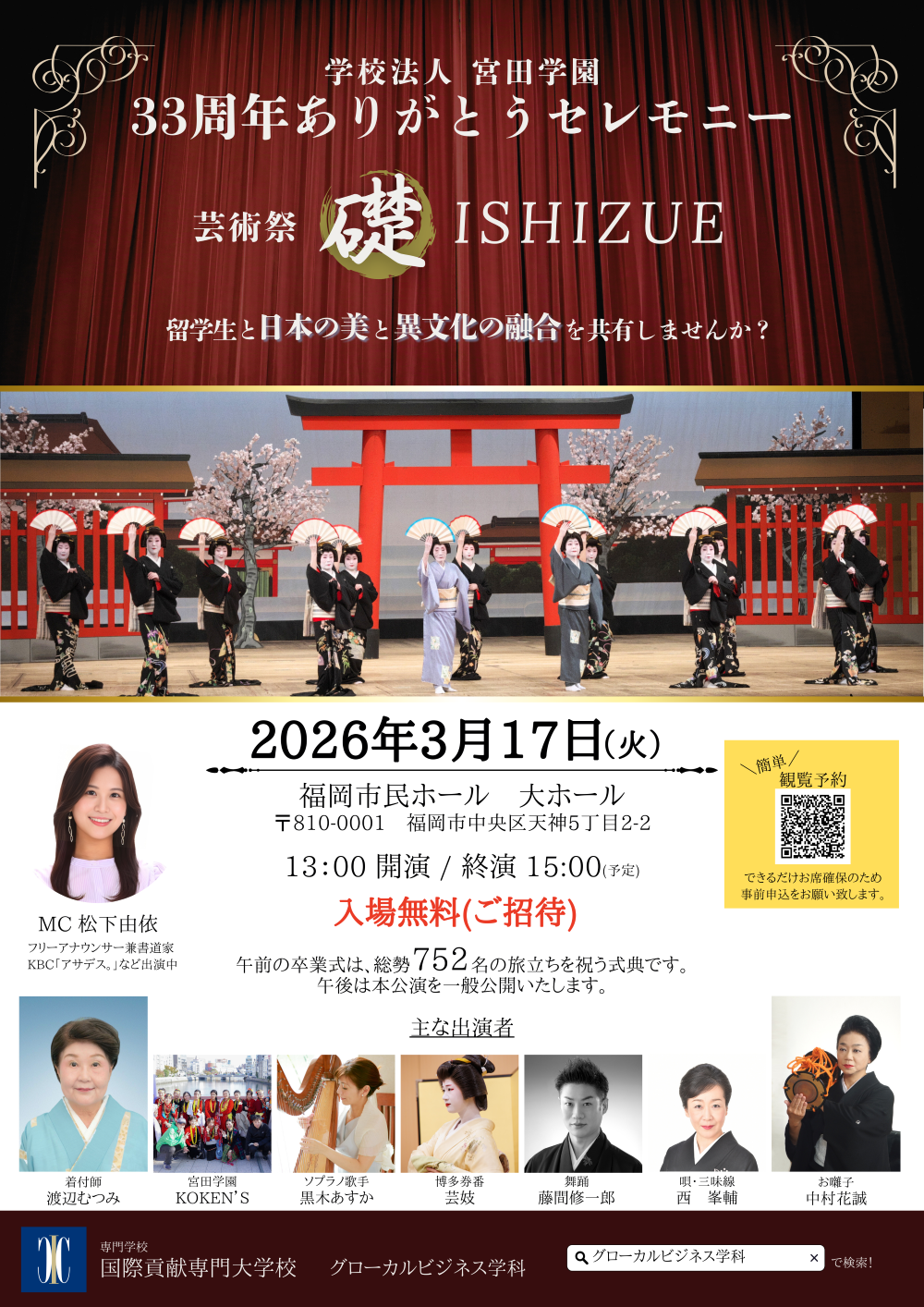 この度、日頃の感謝の気持ちを込め、福岡市民ホールにて「33 周年ありがとうセレモニー」と題し、第 1 部(午前)に卒業式、第 2 部(午後)に芸術祭を開催いたします。本イベントは、卒業を迎える留学生の門出を祝うとともに、本学の建学の精神である「日本伝統文化を礎とした多文化共生社会」を実現するグローカルな学園を目指す一環として開催致します。日本の伝統芸能と、留学生が持つ多様な文化、そしてそれらが融合した新しい表現を一つの舞台で披露することで、学生たちに「本学で学んだ誇り」を胸に刻んでもらい、対外的にはグローカルな教育成果を発信することを目的とします。