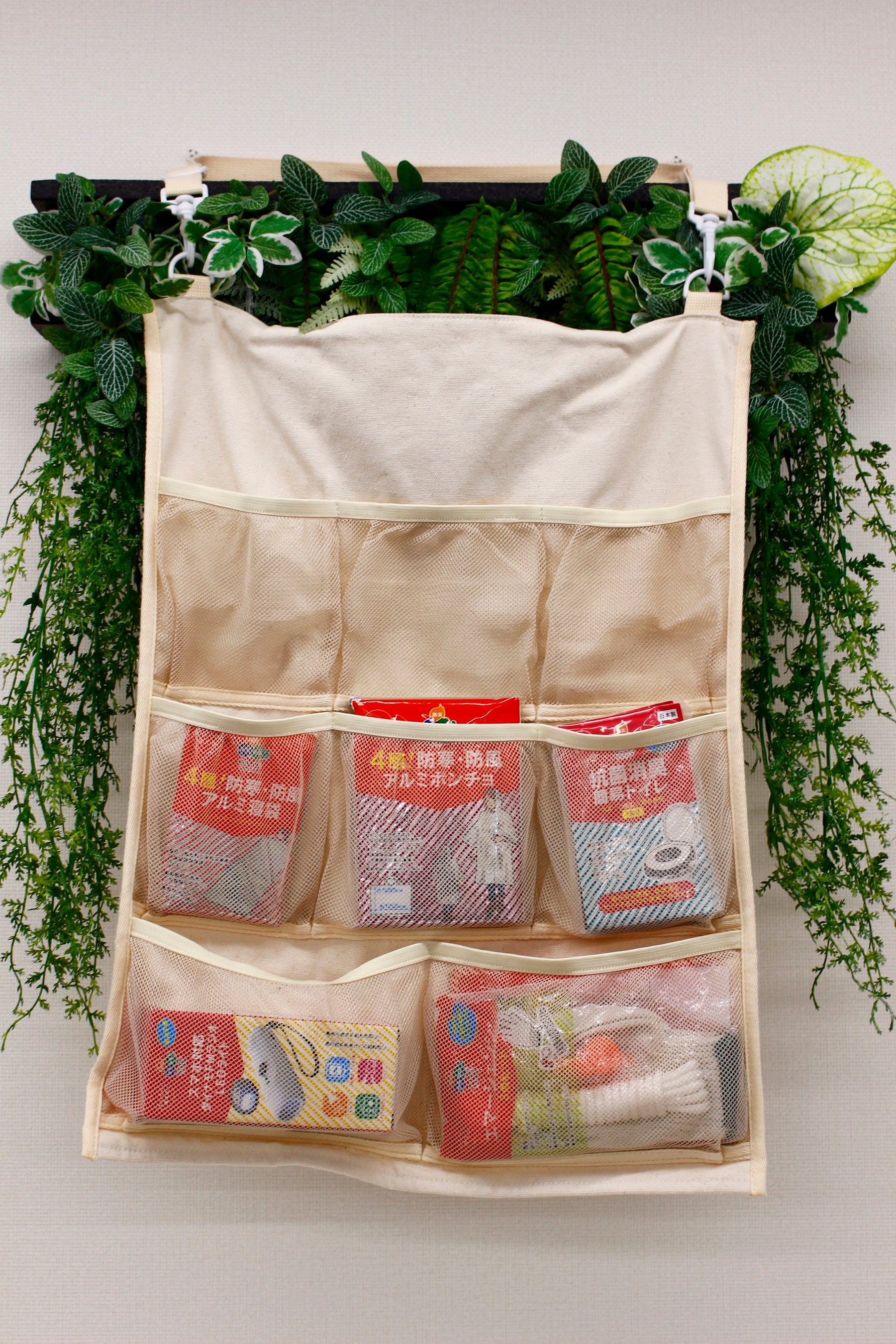 いざという時に持ち出したい避難用グッズを、常に見える場所に収納できる壁掛けタイプの防災ラックです。くるくると丸めれば肩掛けもできるので持ち運びにも便利なのに加え、ポケット別収納なので賞味期限切れなどのチェックも簡単。デコレーションしてタペストリーのように飾ることもできます。