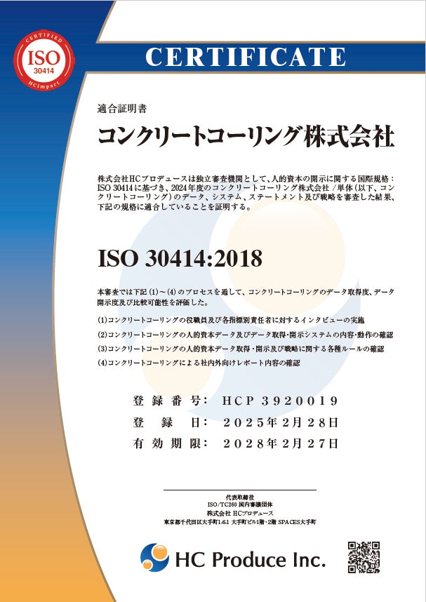 コンクリートコーリング株式会社(西日本)がISO30414の認証を取得