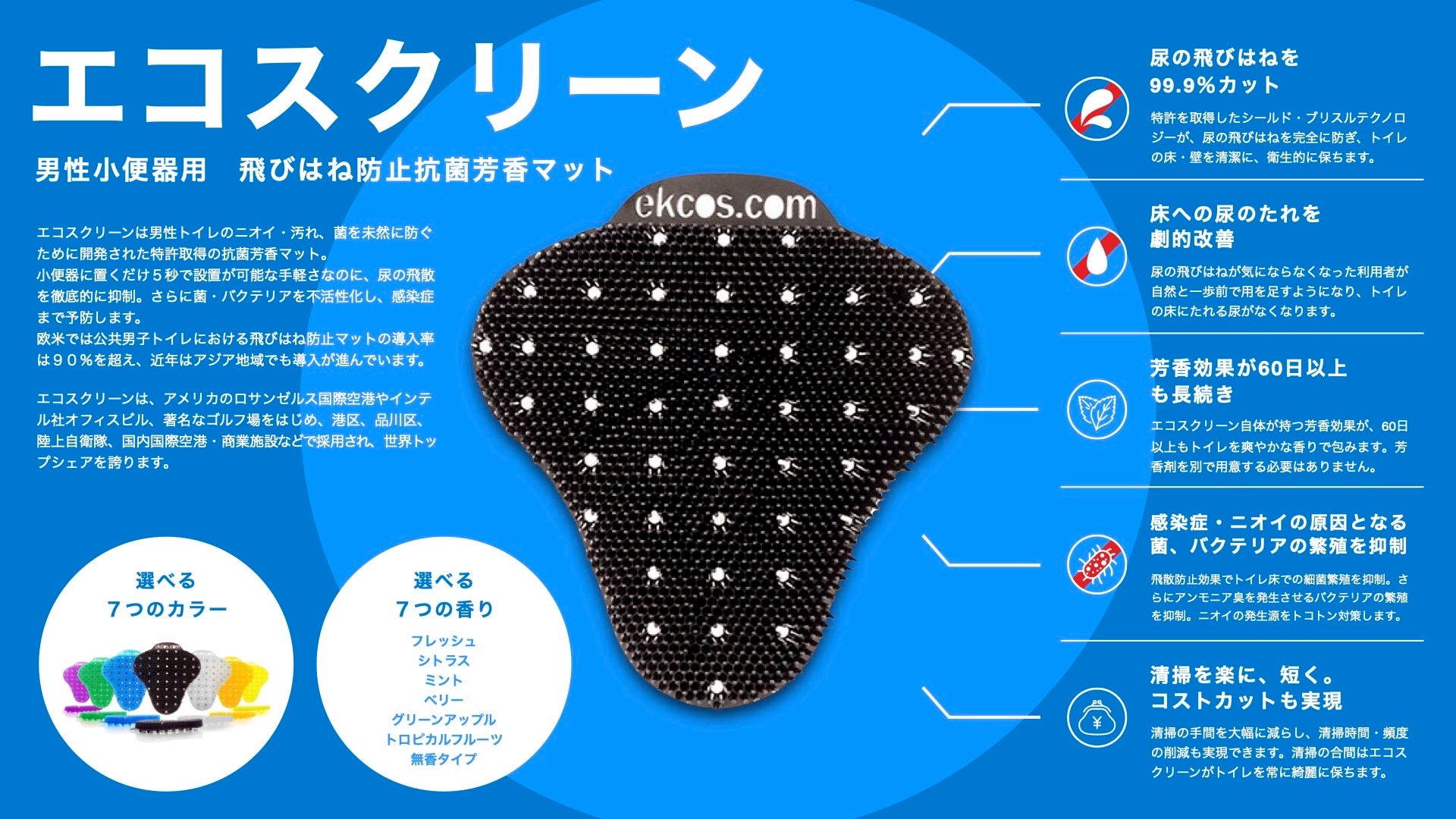 エコスクリーンは男性小便器に置くだけで、尿飛散の抑制、ニオイの改善、感染症のリスク低減、排水管の詰まり防止を実現する抗菌芳香マットです。小便器置き型抗菌芳香マットは、欧米では公共男子トイレにおける導入率90%と非常に身近な商品であり、中でもエコスクリーンは世界トップシェアを誇ります。