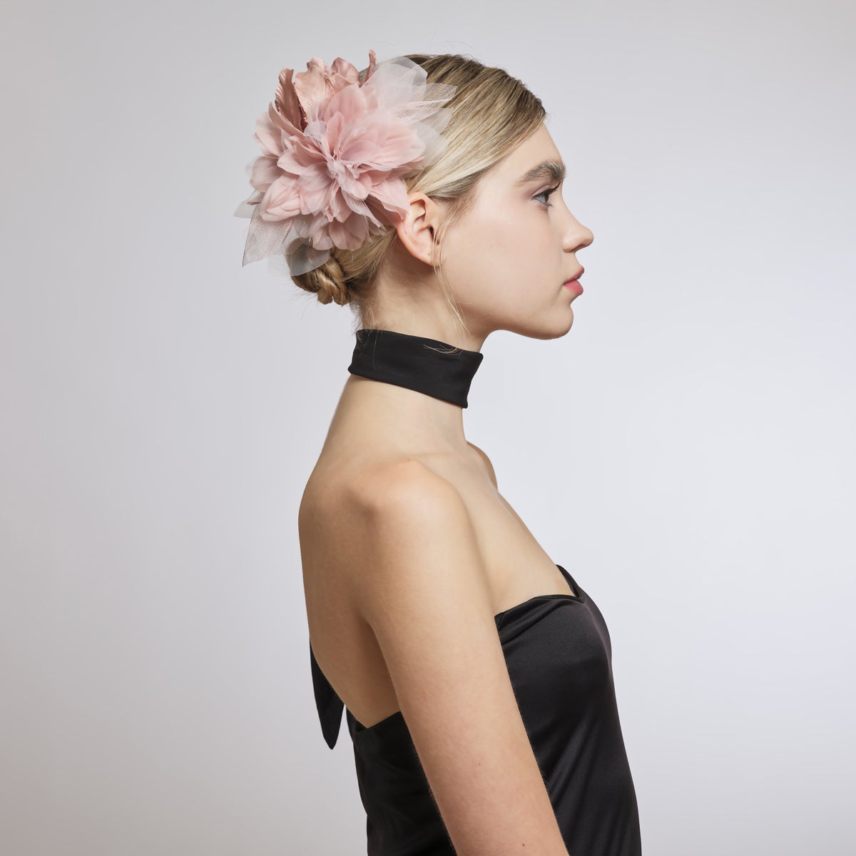 大小二つのロゼットを連ねたオーナメントにはあえてビジューを一切使用せず、洗練された大人のエレガンスを漂わせています。つける位置や他アイテムとのコーディネイト次第でゴージャスにもシックにも展開可能。