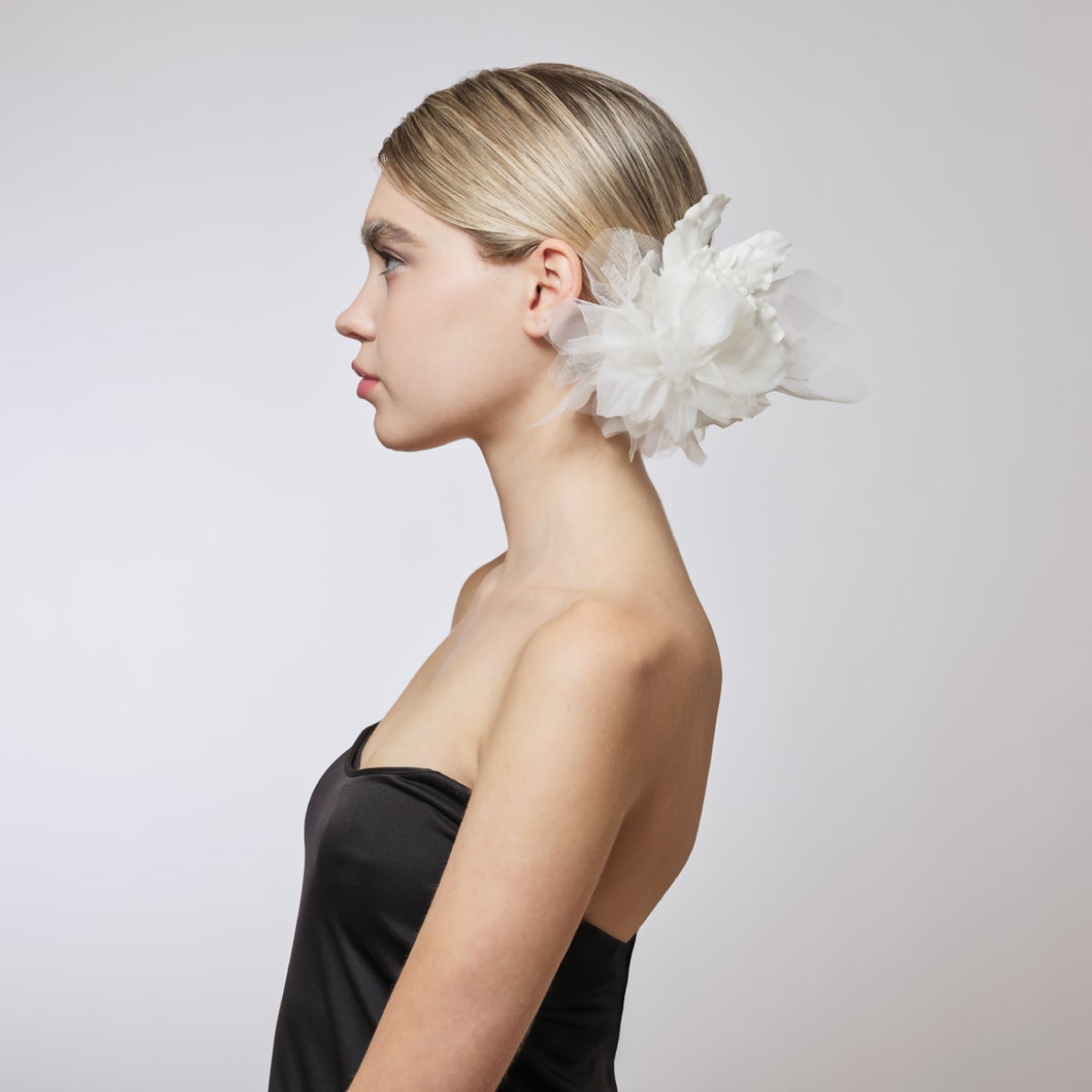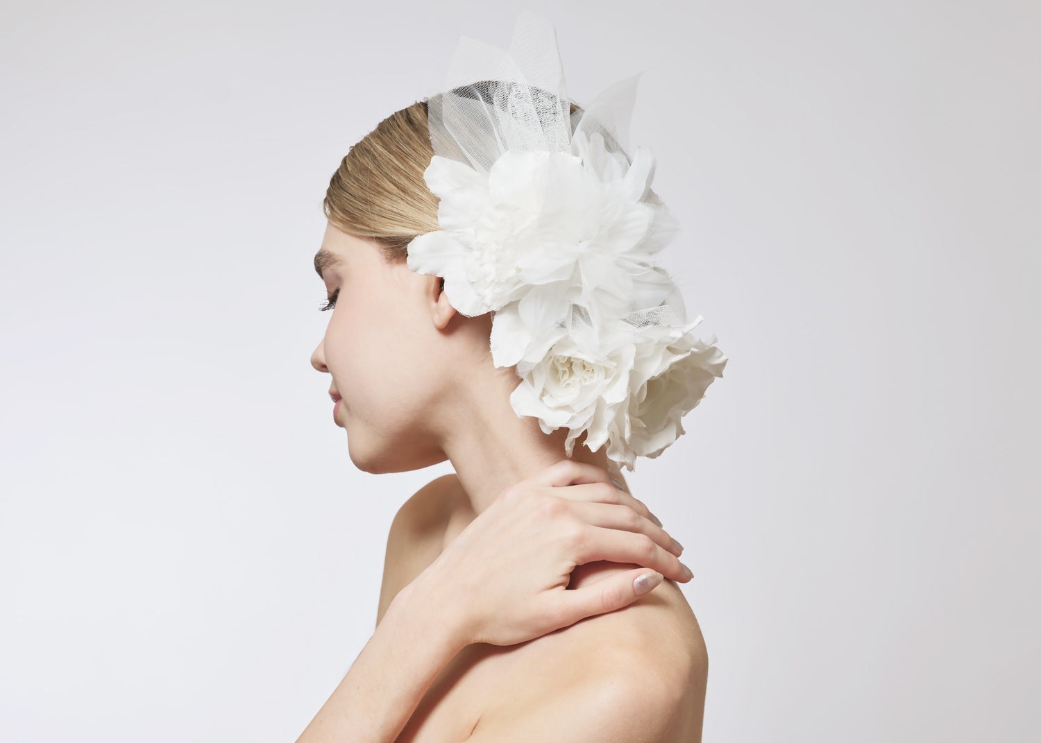 テクスチャーの異なる花びらを職人の手で幾重にも重ね、繊細かつ華やかに仕上げました。切りっぱなしのチュールの表情を生かし、ビジューを敢えて使用しない潔いデザインが特徴。
