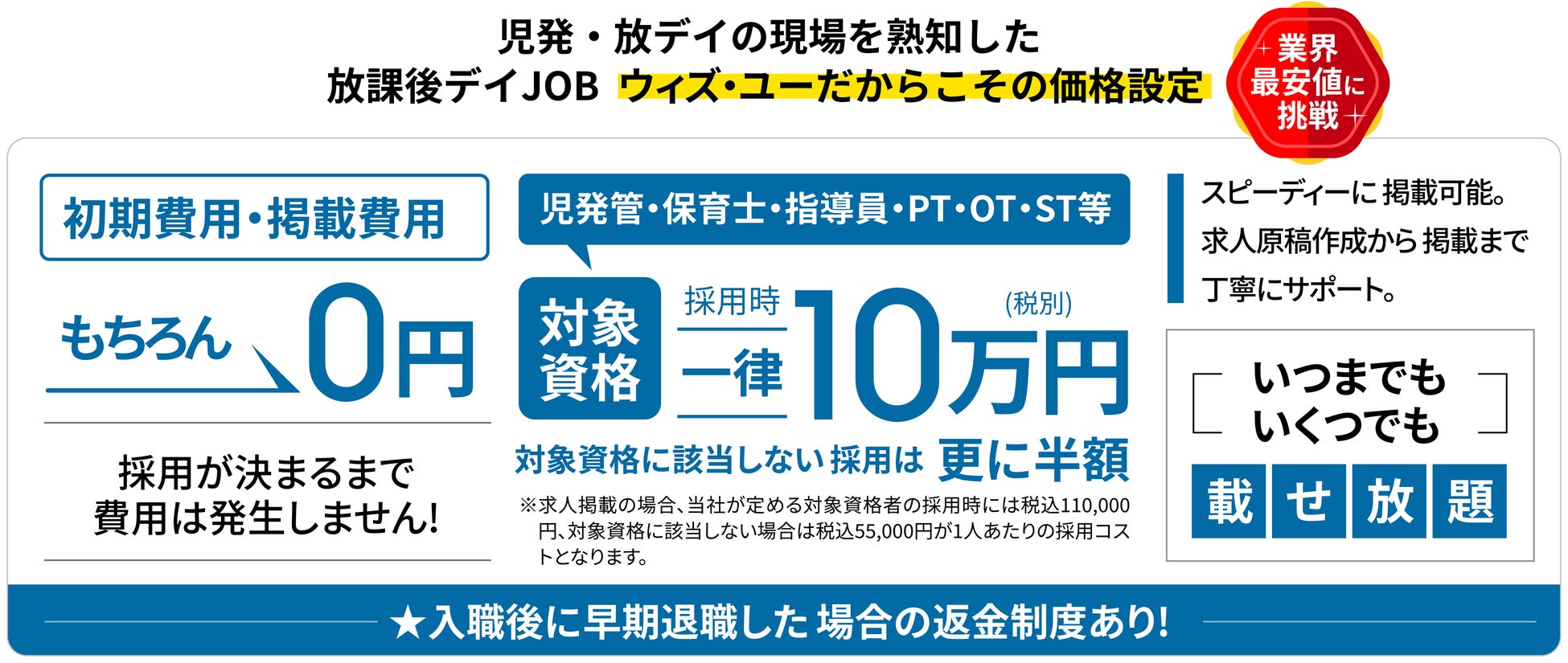 ★このような業界の抱える問題の打開策として、当社がこれまでフランチャイズ本部として培ってきた経験を活かし、業界最安値の料金設定で全国の事業者様の採用活動を支援します。施設に通いたい子どもたちの為に、また子どもたちをサポートする事業者様の為に、求人メディア「放課後デイJOB ウィズ・ユー」を是非ご活用ください。