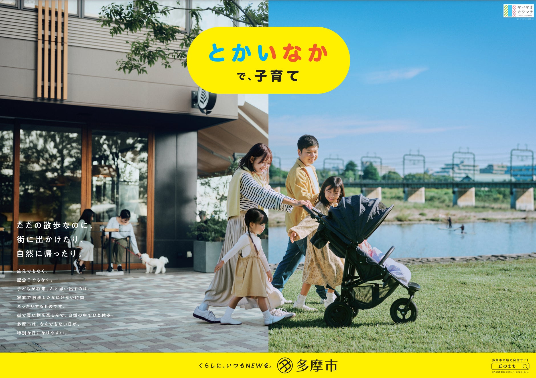 今回、子育て世代の家族が多摩市内にある自然豊かな人気スポットを保有する「とかいなか」で、充実した時間を過ごす雰囲気を表現した交通広告となっています。