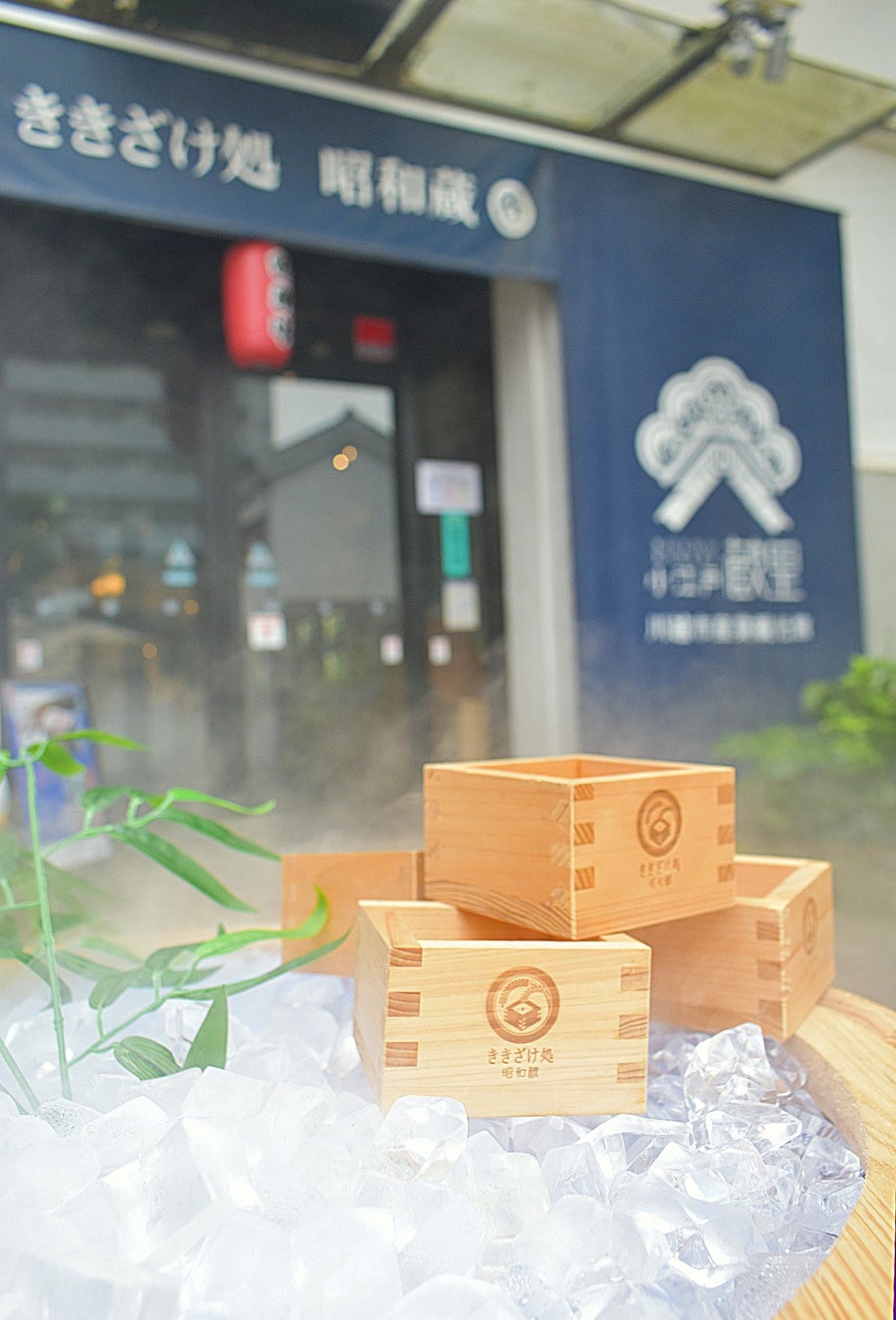 ききざけ処昭和蔵の店頭には、実際に使用されていた酒樽を使ったオブジェを設置。