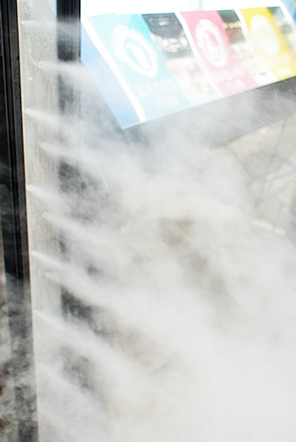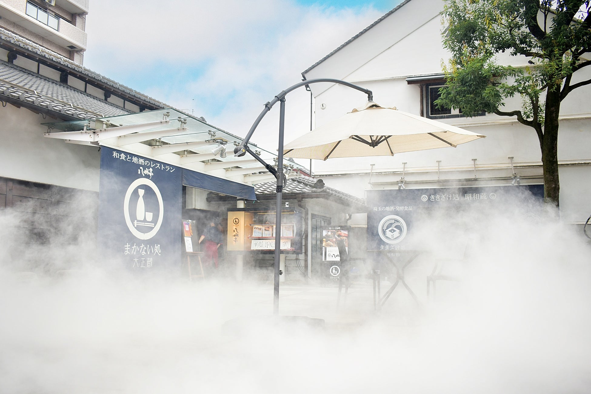 店舗入り口や広場奥に6台の雲海発生装置を設置し、涼しいミストを放出します。冷却用ミストは一般的に周辺の気温を2~3℃低下させる効果があると言われています。