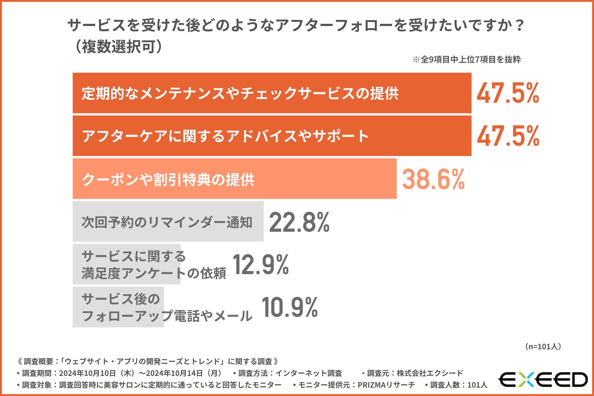 そこで、「サービスを受けた後どのようなアフターフォローを受けたいですか?」と質問したところ、『定期的なメンテナンスやチェックサービスの提供(47.5%)』『アフターケアに関するアドバイスやサポート(47.5%)』と回答した方が最も多く、次いで『クーポンや割引特典の提供(38.6%)』となりました。
