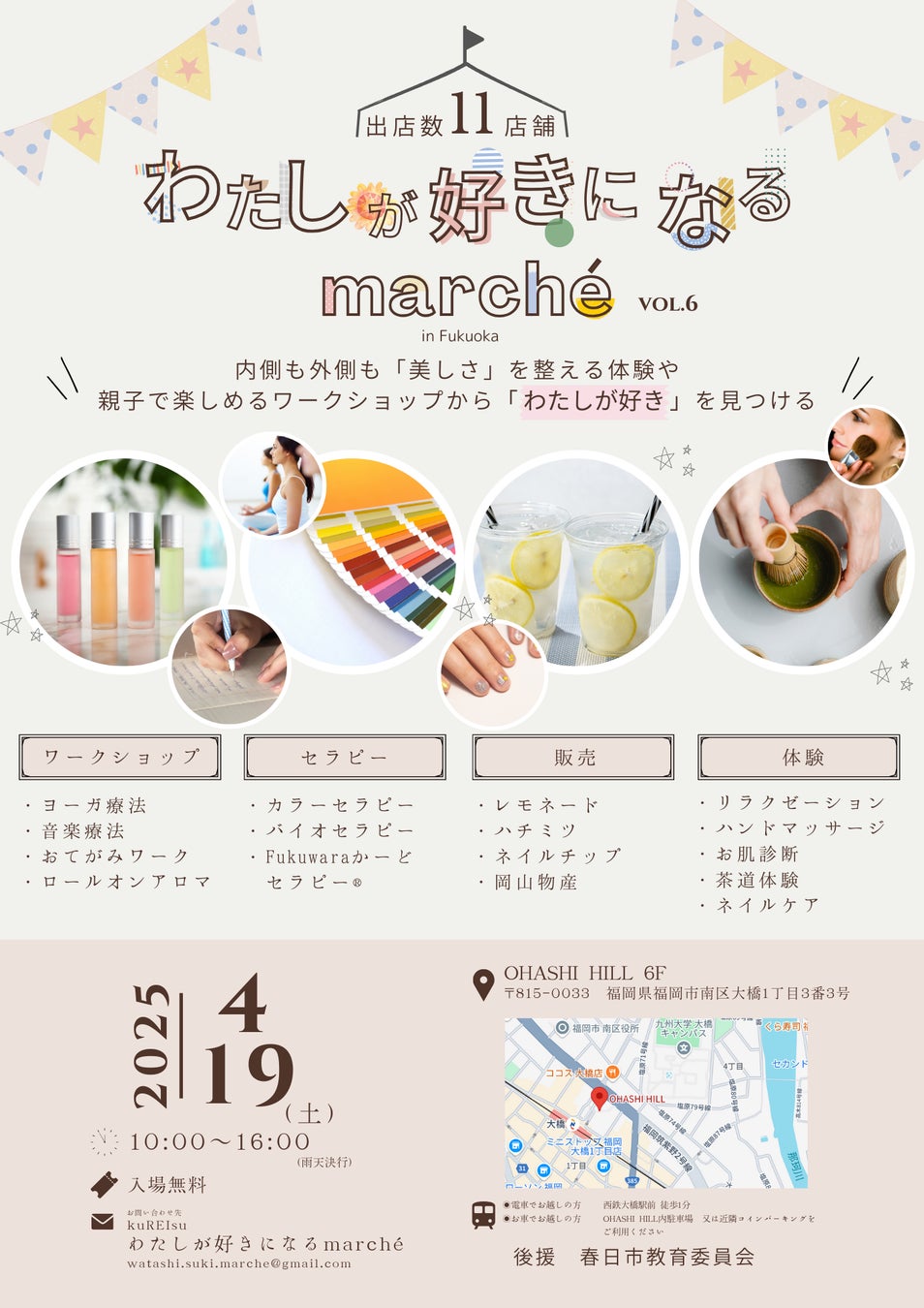 合同会社kuREIsu(本社:岡山県、代表:楠レイ)は、2025年4月19日(土)に、福岡市南区大橋の再開発エリア「OHASHI HILL」にて、九州初開催となる「わたしが好きになるmarché vol.6」を開催いたします。全国の出店者が集まり、「自分の好きなことを見つける場」を提供する本イベントは、地元のマルシェとは異なる、新しい形のつながりを生み出す場として注目されています。