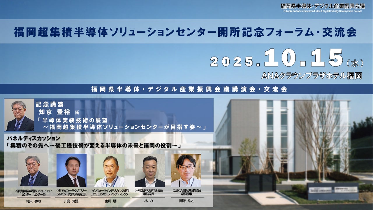 この度、両センターを統合し、新たに「福岡超集積半導体ソリューションセンター」を開所したことを記念して、10月15日(水)にフォーラム・交流会を開催します。