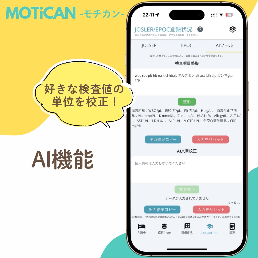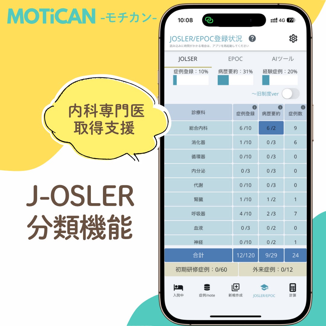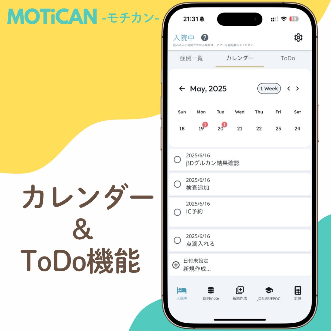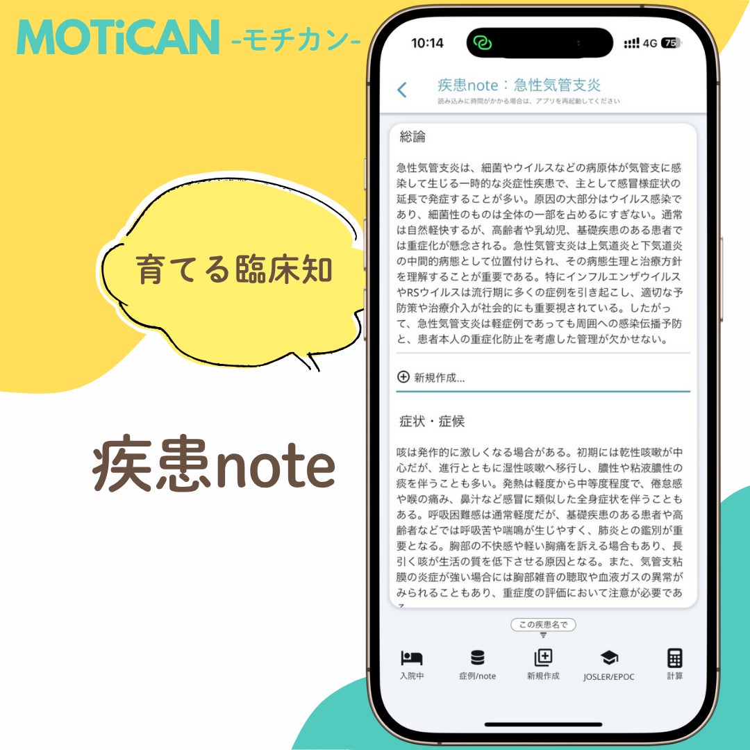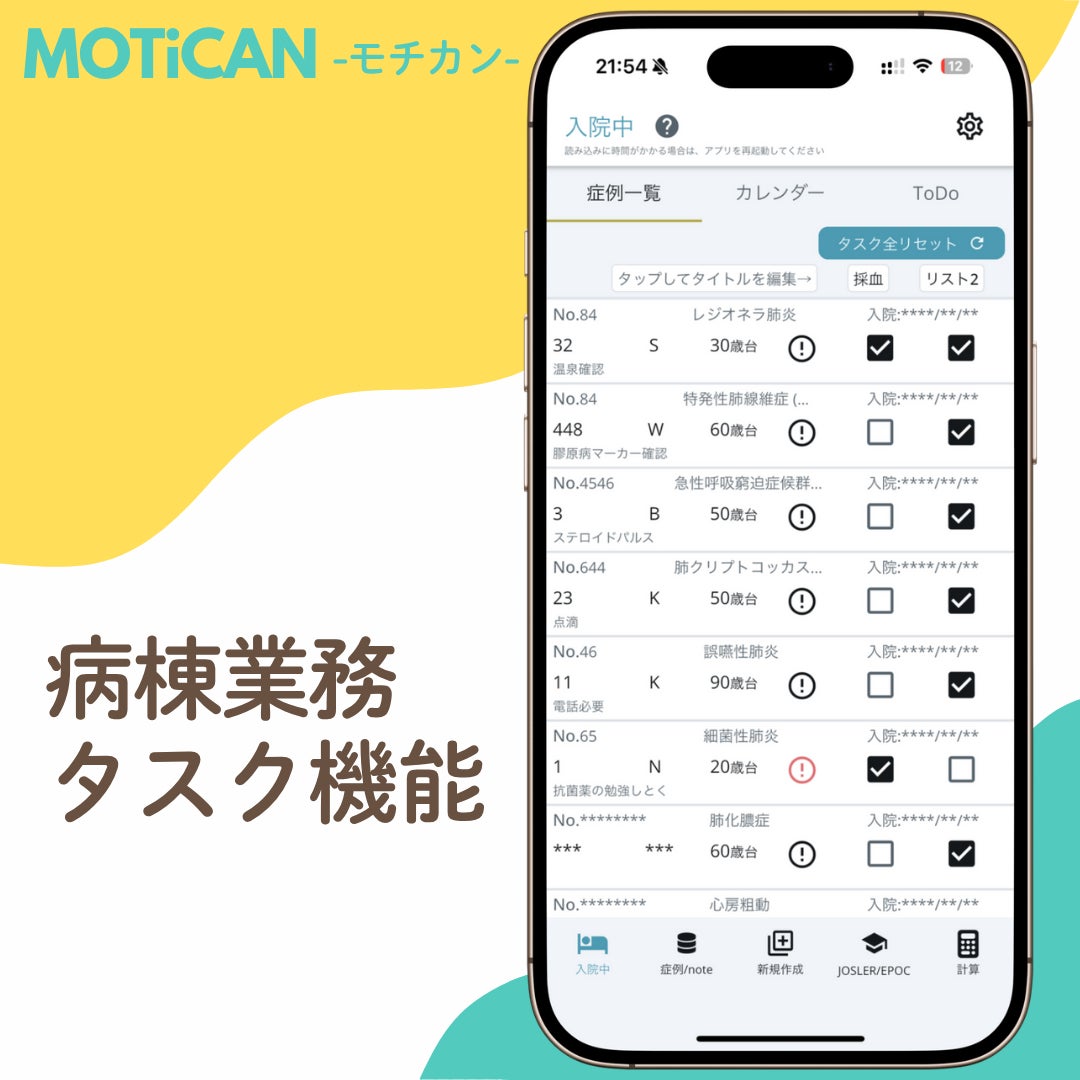「MOTiCAN-モチカン-」は、現役医師が自身の経験をもとに開発した、医師の病棟業務効率化と経験疾患をベースとした自己学習、内科専門医取得をサポートするためのスマートフォンアプリです。