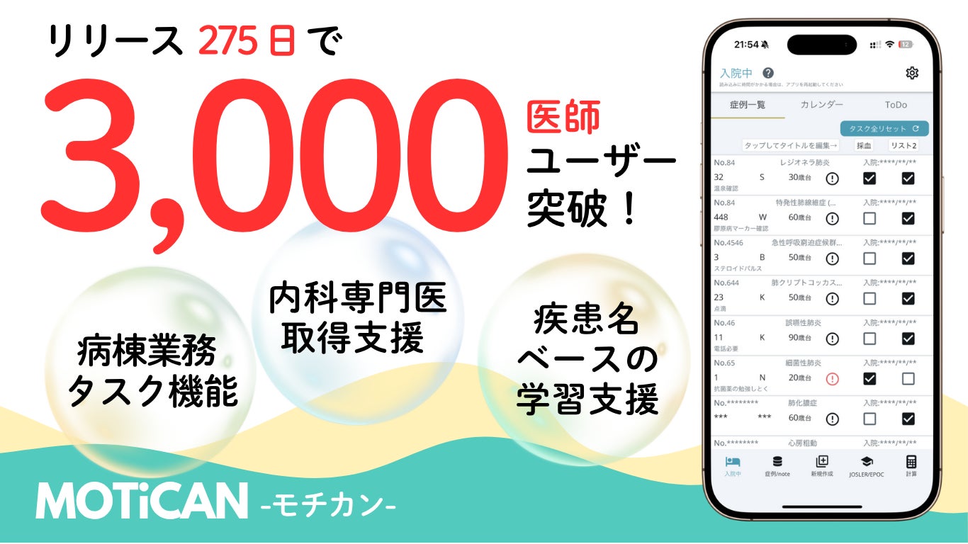 株式会社MedicalAppが提供する、医師の働き方を支援するアプリ「MOTiCAN(モチカン)」の利用ユーザー数が、サービス開始から275日で3,000人を突破したことをお知らせいたします。