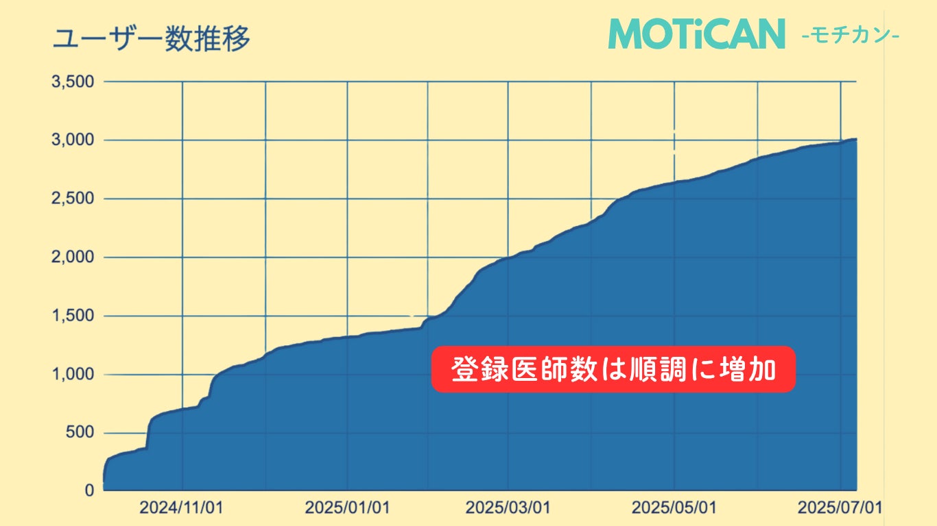 「MOTiCAN」は、大規模な広告宣伝を行うことなく、主にSNSでの口コミを中心に支持を広げ、サービス開始から275日という速さで登録医師数は3,000人(社内カウント)を突破いたしました。