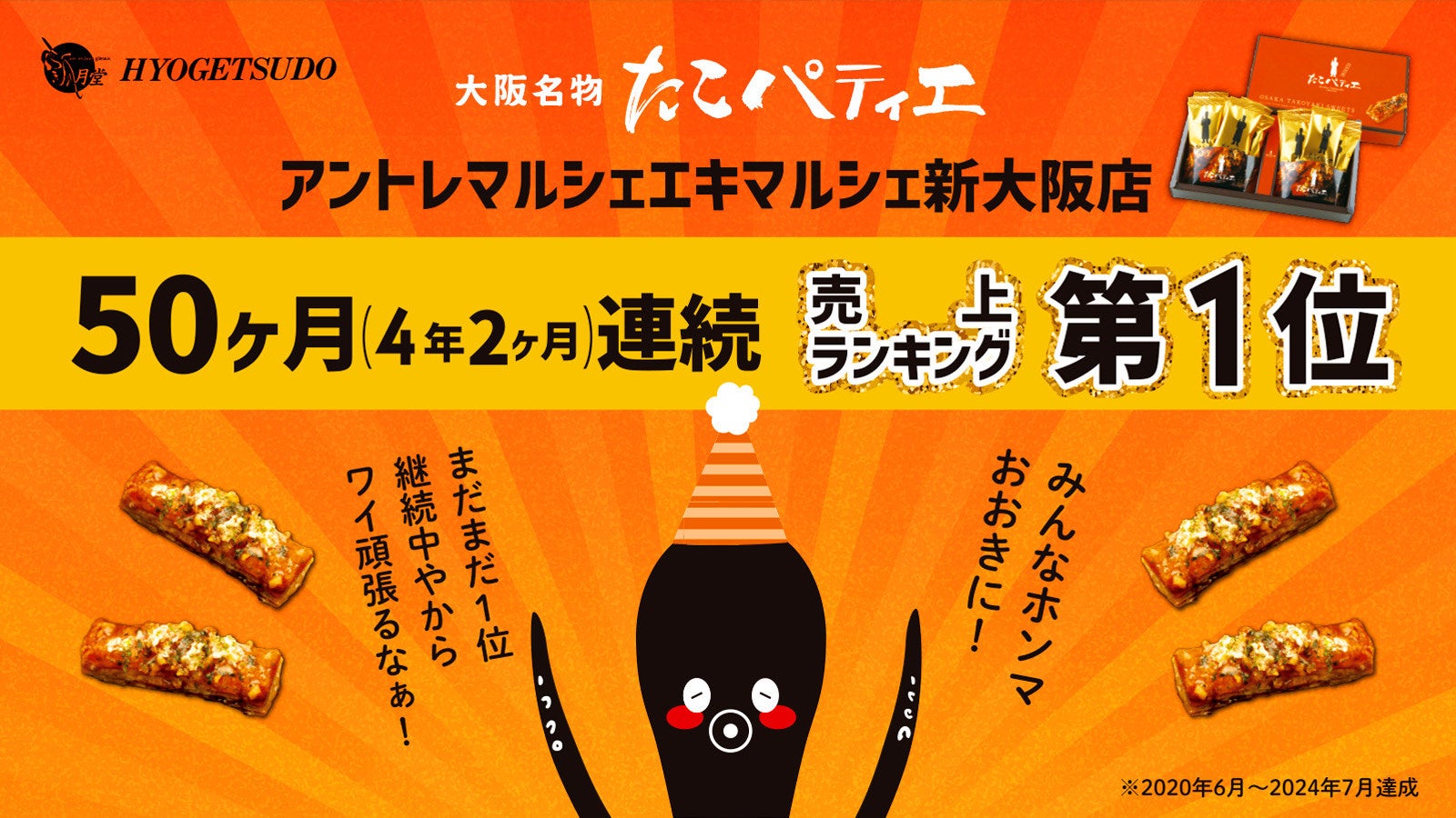 パティシエが作る、本格たこやきスイーツ「たこパティエ」を販売する株式会社瓢月堂(本社:大阪府八尾市、代表取締役:岡田博美)は、同商品が、2020年6月から2024年7月までの50か月連続で「アントレマルシェエキマルシェ新大阪店」のお土産ランキングで1位を獲得したことをお知らせいたします。(株式会社ジェイアール西日本デイリーサービスネット調べ)