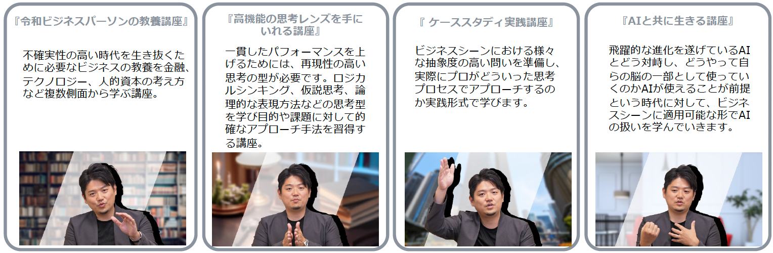 基本コース:「令和ビジネスパーソンの教養」「高機能の思考レンズを手にいれる講座」「ケーススタディ実践講座」「AIと共に生きる講座」