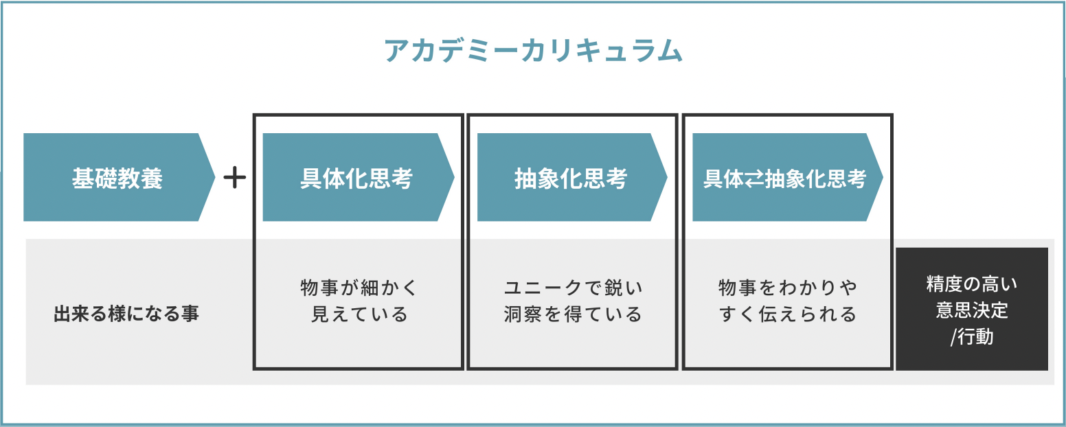 日本教育は、小学校から始まり長いと大学、大学院まで10数年間かけて行われることが一般的です。特に義務教育では「答えの決まった問題を解く」側面が強く出ています。しかし社会人、もしくは手前の就職活動において、「自分の頭で答えの無い問題を定義し、自分の洞察から答えを出す」側面が強く、これまで受けてきた教育と全く異なった要求が社会から求められるのが実態かと思います。企業でも自ら課題を発見してステークホルダーを説得して自らの責任で意思決定するような能力が評価されています。社会の中で「精度の高い意思決定を行うために解像度高く思考する」ことを“フォーカス思考”とし、この力を身につけて、不確実なこの世界の中で皆さんの市場価値を高め、ひいては自己実現の一助になるべく、本アカデミーの開講に至りました。