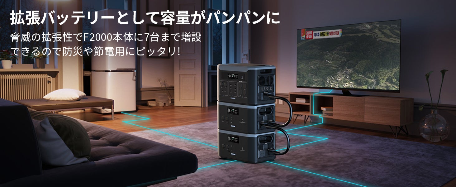 ‐拡張バッテリーとしてF2000/F4000本体に最大7台に増設、16384Whまで超大容量を実現