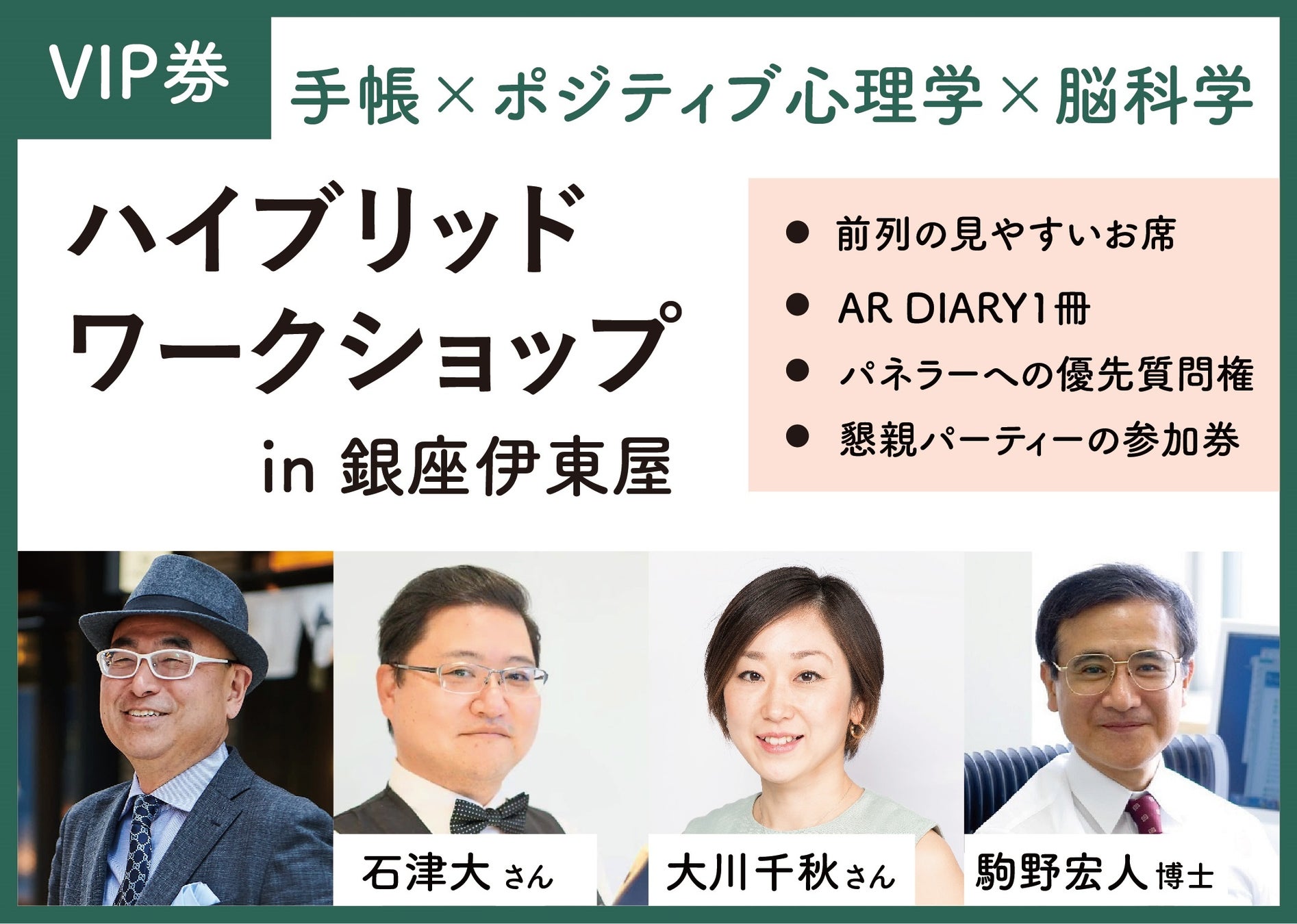 VIP券は、ワークショップの参加券に加え、AR DIARY1冊基本セット、パネラーへの優先質問権、懇親パーティーの参加券が付いています。また、ワークショップでは前列の見やすいお席をご用意させていただきますのでお得です。