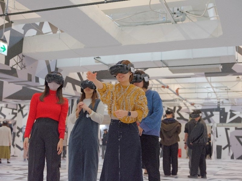 来場者はヘッドマウントディスプレイを装着し、広大な空間を自分の足で自由自在に歩き回りながら、異世界を旅するかのような没入体験を味わえます。VRデバイスのカメラが壁や床に描かれているマーカーを認識するため、体験者同士が互いを認識できるようになっており、心ゆくまでXR作品に没入できます。4名までのグループで体験することができ、5名以上の場合は2つのグループに分かれて同時に作品を楽しめます。
