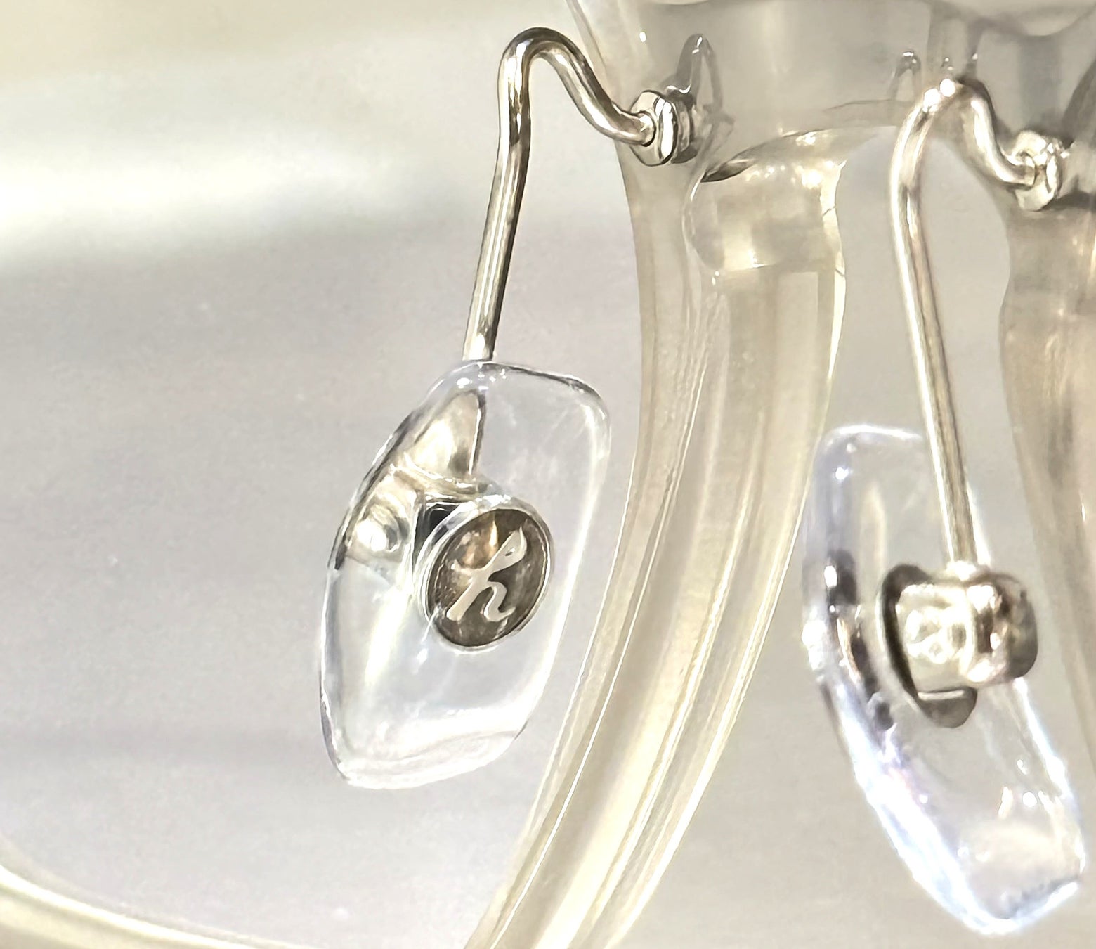 体温に反応して緩やかに形状が変化する、哺乳瓶の口にも使用されるアレルギーフリーな特殊な樹脂を採用した独自仕様のノーズパッドです。立体的なカーブ形状を用いて様々な鼻の形状にアジャストすることでノーズパッドの跡がつきにくくなります。鼻筋にアジャストすることで眼鏡が下がりにくくなり、快適な眼鏡装用を担うノーズパッドです。また、オリジナルロゴを記したパッド芯はチタンを使用することで腐食が発生することを防ぎます。