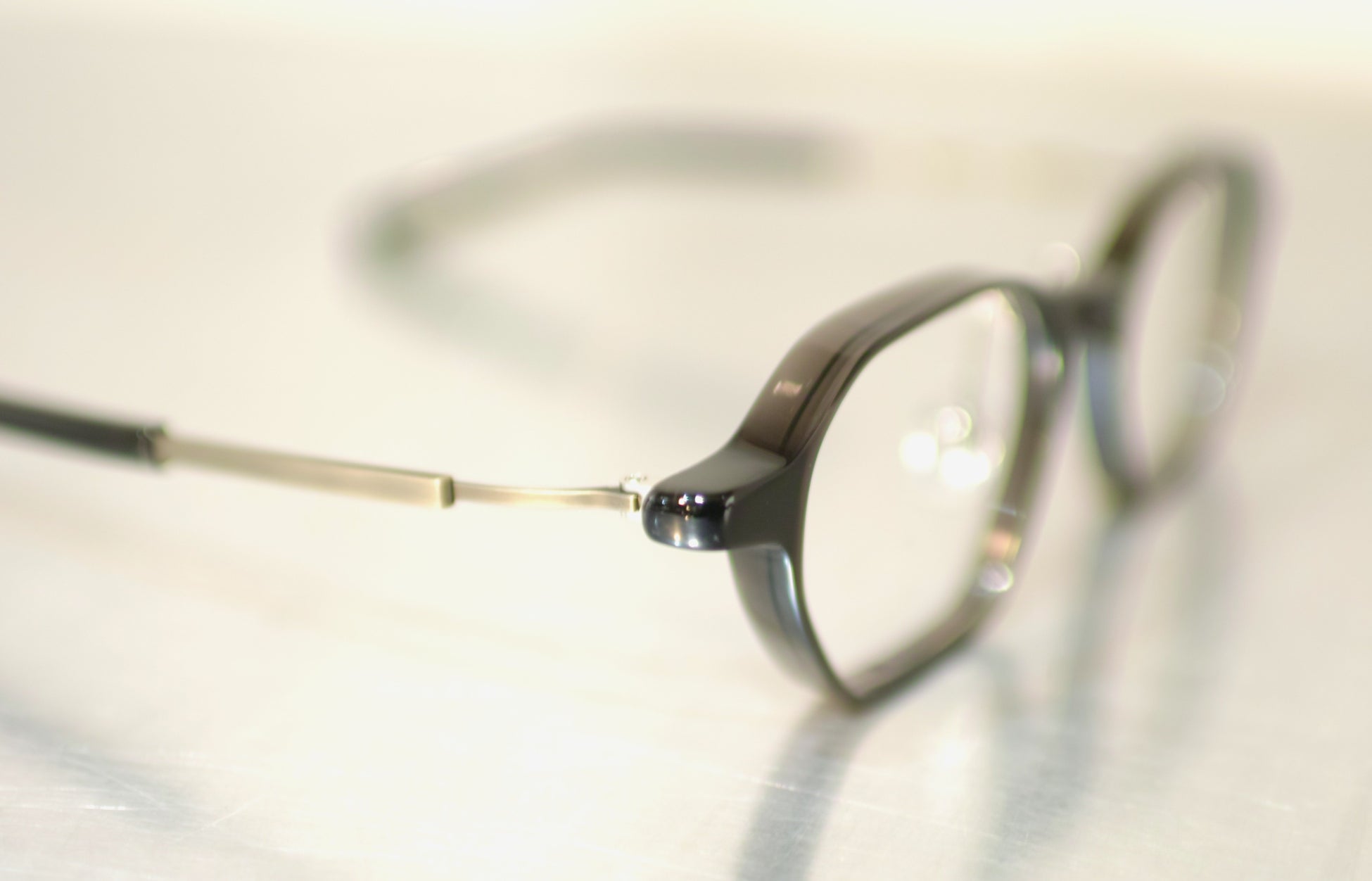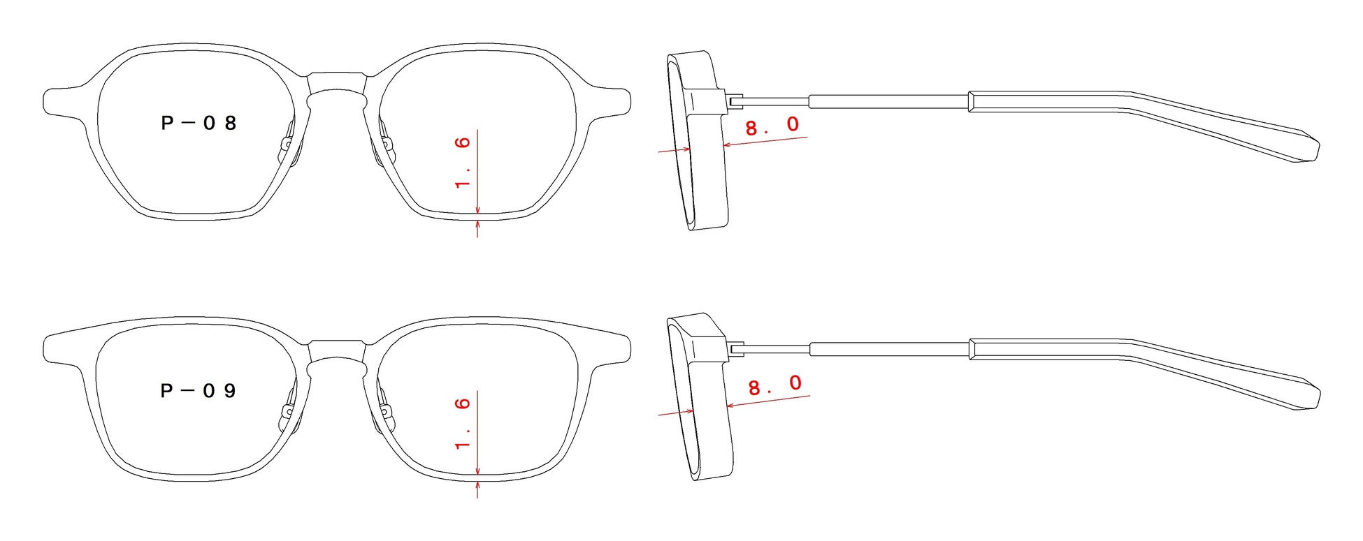 新商品「P-08、P-09」は極細(1.6mm)の正面視でありながら耳側までぐるりとレンズを包み込む8mmのリムで構成されるフロントパーツを採用しているため、度数の関係でレンズの厚みがある方でもはみ出る可能性が非常に低く、不意に直接何かにぶつかるなどの外的要因からもレンズを守り、より一層安心して使用することが出来る眼鏡フレームです。メタルテンプルはチタンを用いたフレキシブルな設計のため、快適な掛け心地を実現しました。さらに独自仕様のノーズパッドは体温に反応して形状が緩やかに変化する素材と形状を採用することで、多様な鼻筋に対してアジャストし、ノーズパッドの跡がつきにくくなります。