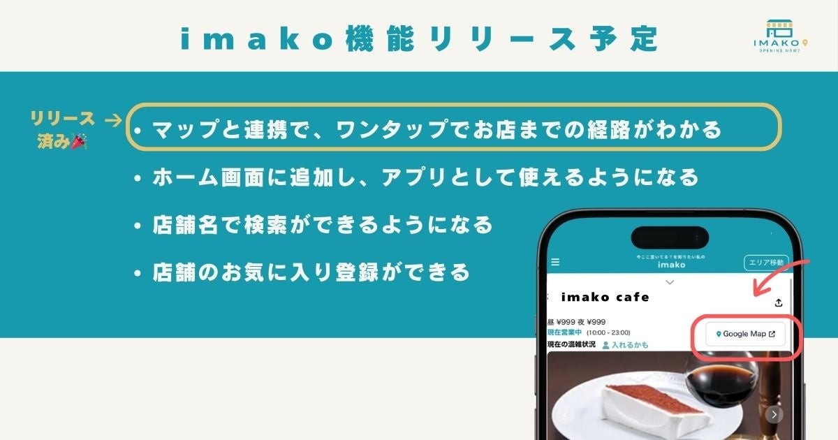 imakoでは、ユーザーの声を拾い機能として反映しながら開発を進めています。直近では、「Google マップ」への動線を追加し、カフェまでの順路がワンタップでわかるようにいたしました。