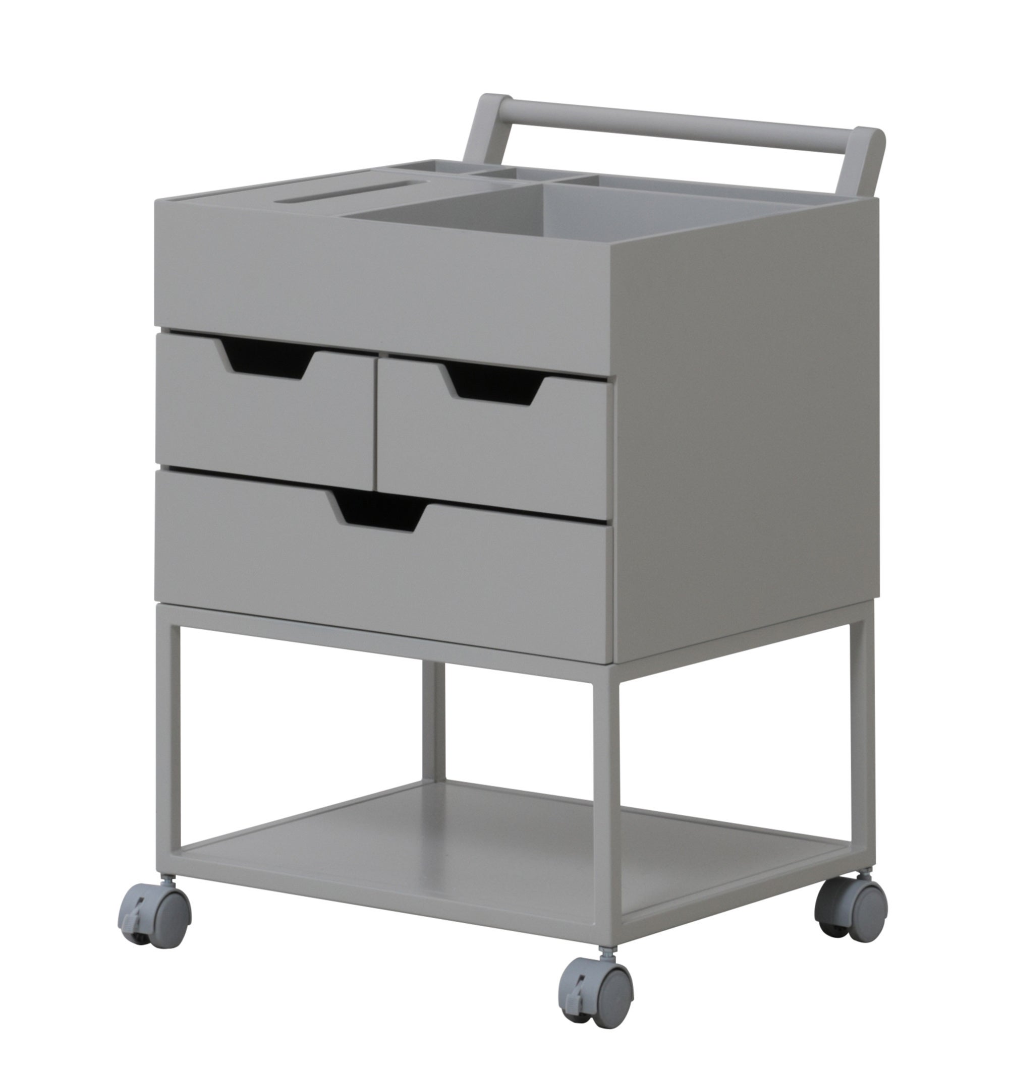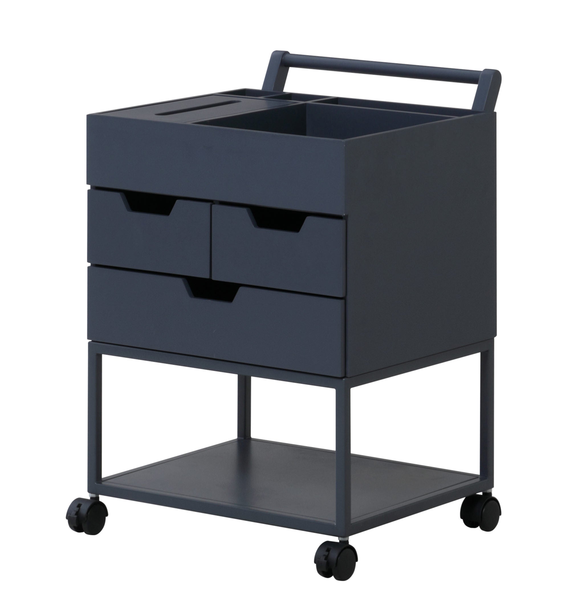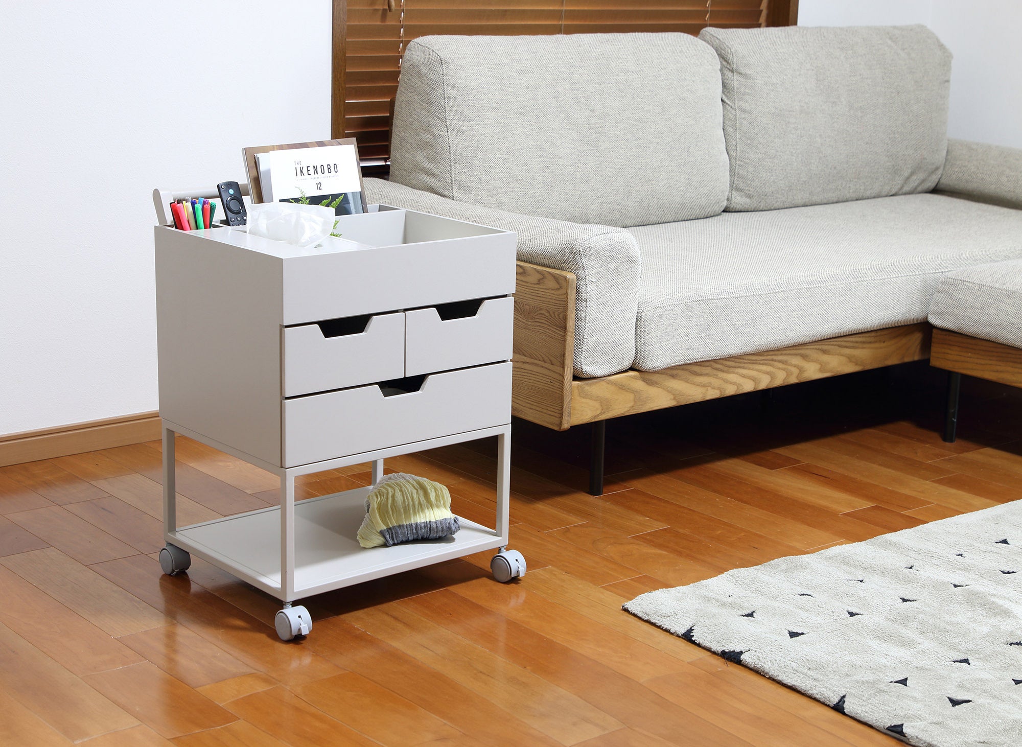 上部・下部のオープン収納部と3つの引き出しを備えており、リモコンや文房具などの頻繁に使う小物やお薬などを整理しながら収納。ハンドルとキャスター付きで、生活動線に合わせて移動させることができます。