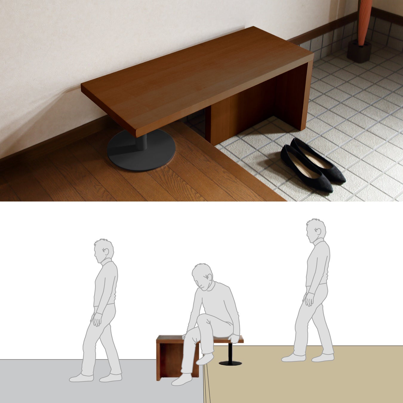 “框のせ玄関ベンチ”は、玄関の段差を利用したベンチです。屈んで行う靴の脱ぎ履きにストレスを覚える歳になっても、毎日の外出を楽しくしてくれるアイテムです。