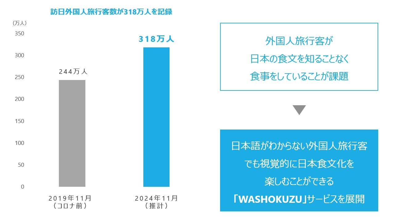 近年、日本を訪れる外国人旅行客は急増しています。日本政府観光局(JNTO)によると2024年11月の訪日外国人旅行者数はコロナ前の2019年11月の同月比を30.5%も上回る318万人を記録しています。観光業界はその恩恵を受けていますが、外国人旅行客が日本食の背景にある文化まで深く理解しているかというと、まだ十分とは言えません。
