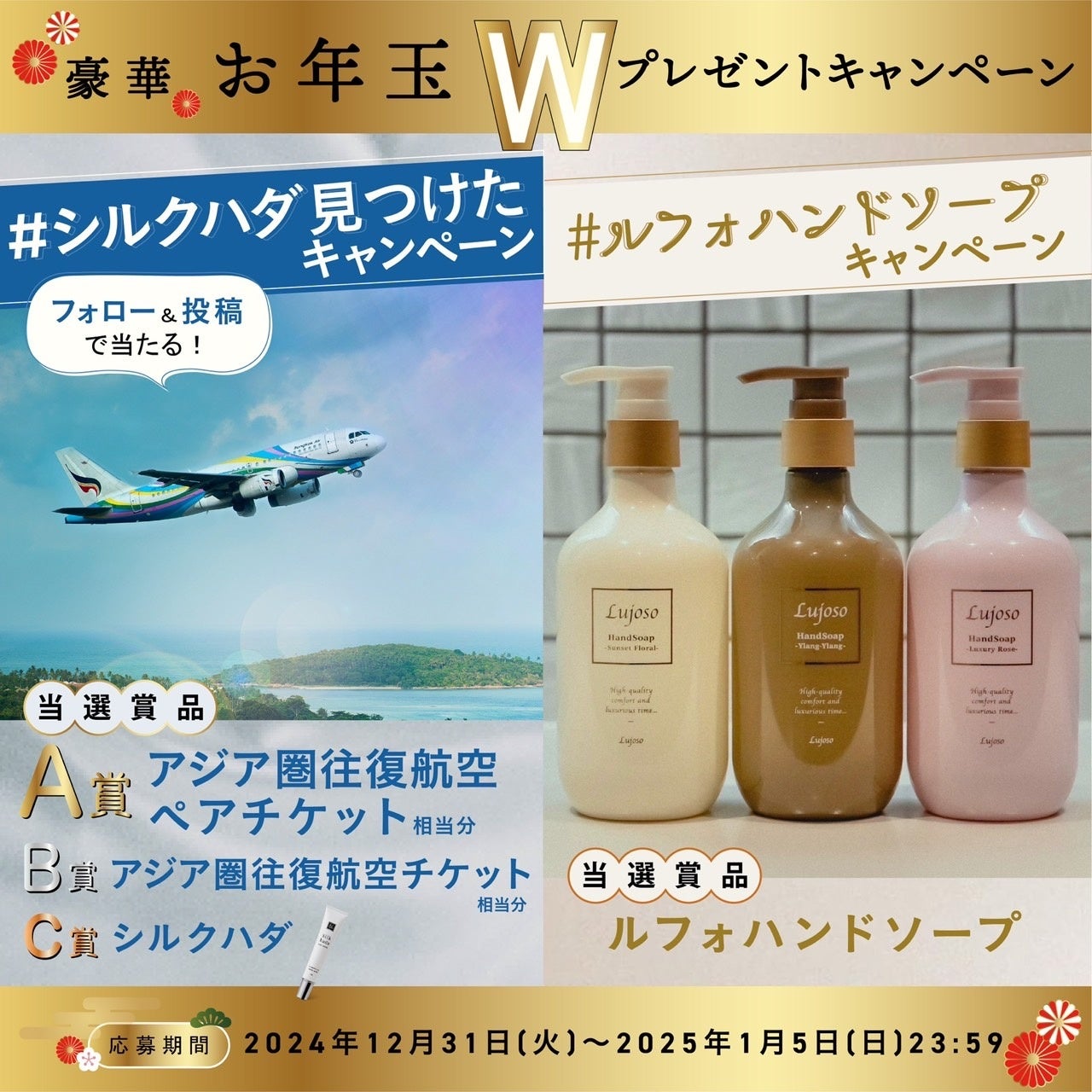 全国バラエティーショップやドラッグストアで大好評中の、まるで香水のようなボディソープ 「Lujoso」や、塗る毛穴パックで話題のフェイスクリーム「Silk hada 」を展開している株式会社Enbeauteから豪華な海外旅行プレゼントのお年玉キャンペーンを開催!