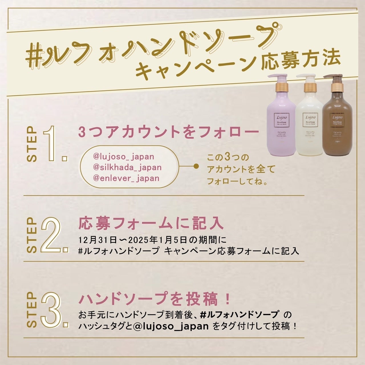 キャンペーンのご連絡は「Lujoso公式インスタグラムアカウント( @lujoso_japan )」、または「アンボーテ公式Xアカウント( @EnbeauteJP )」よりDMをお送りします。キャンペーンの当選に伴いクレジットカード番号をお伺いすることは一切ございません。