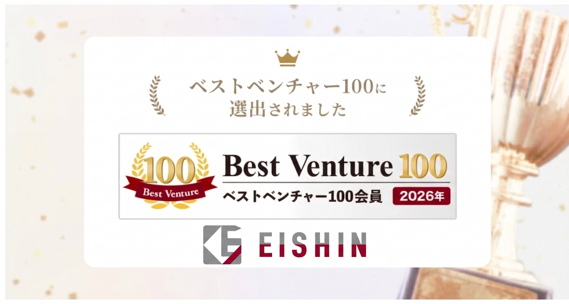 2026年1月、株式会社EISHIN(本社:東京都品川区、代表取締役:五十嵐 大士、以下「EISHIN」)は、イシン株式会社が主催する、今後の成長が期待されるベンチャー企業100社を選出する「ベストベンチャー100」に初めて選出されましたことをお知らせいたします。