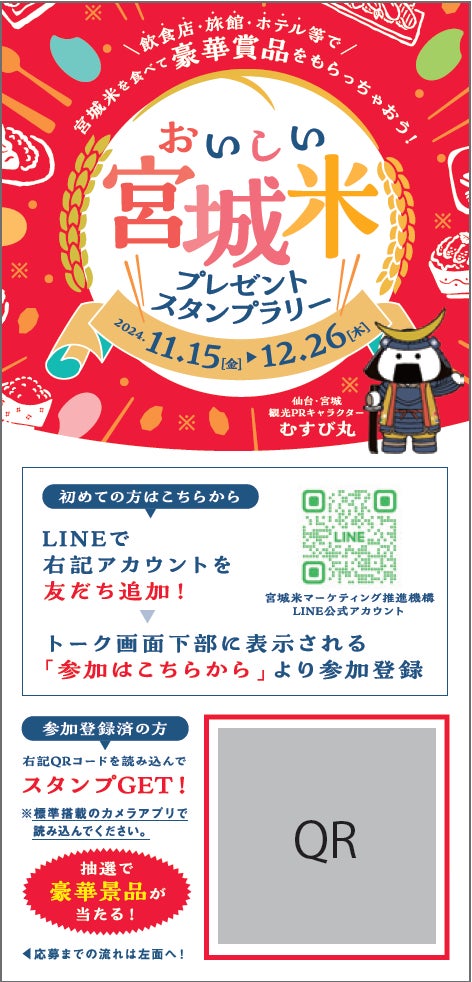 宮城米マーケティング推進機構(会長:宮城県知事 村井 嘉浩)では、良質でおいしい宮城米を用いた米飯を提供する全国の飲食店・ホテル・旅館等を「おいしい“宮城米”米飯提供店」(以下、「提供店」)として指定しています。このたび、全国の提供店において、11月15日(金)より「おいしい“宮城米”プレゼントスタンプラリー」を開催します。