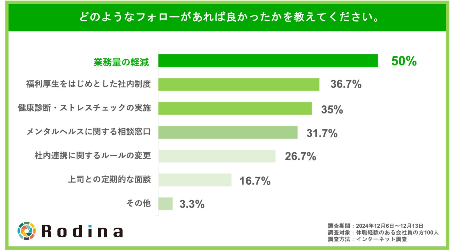 休職から復職した際に、「十分なフォローを受けられていないと感じている」と回答した方に対して、具体的にどのようなフォローがあれば良かったかを聞いたところ、「業務量の軽減(50%)」と回答した方がもっとも多い結果となりました。