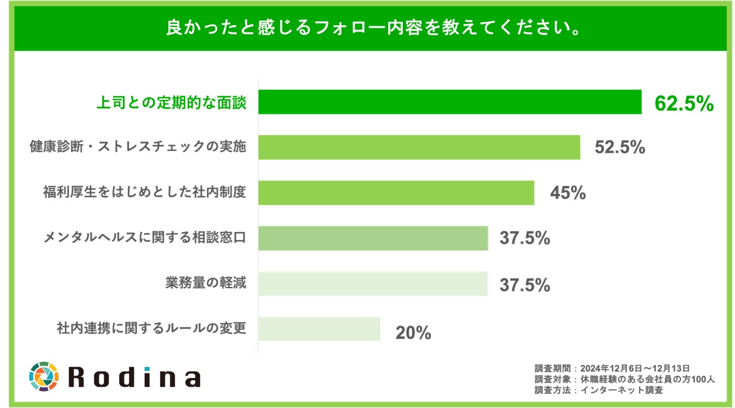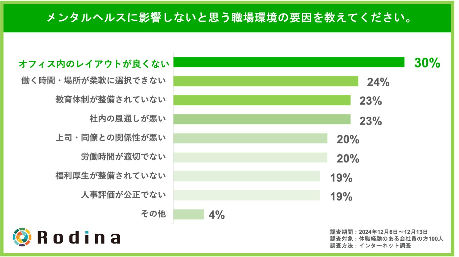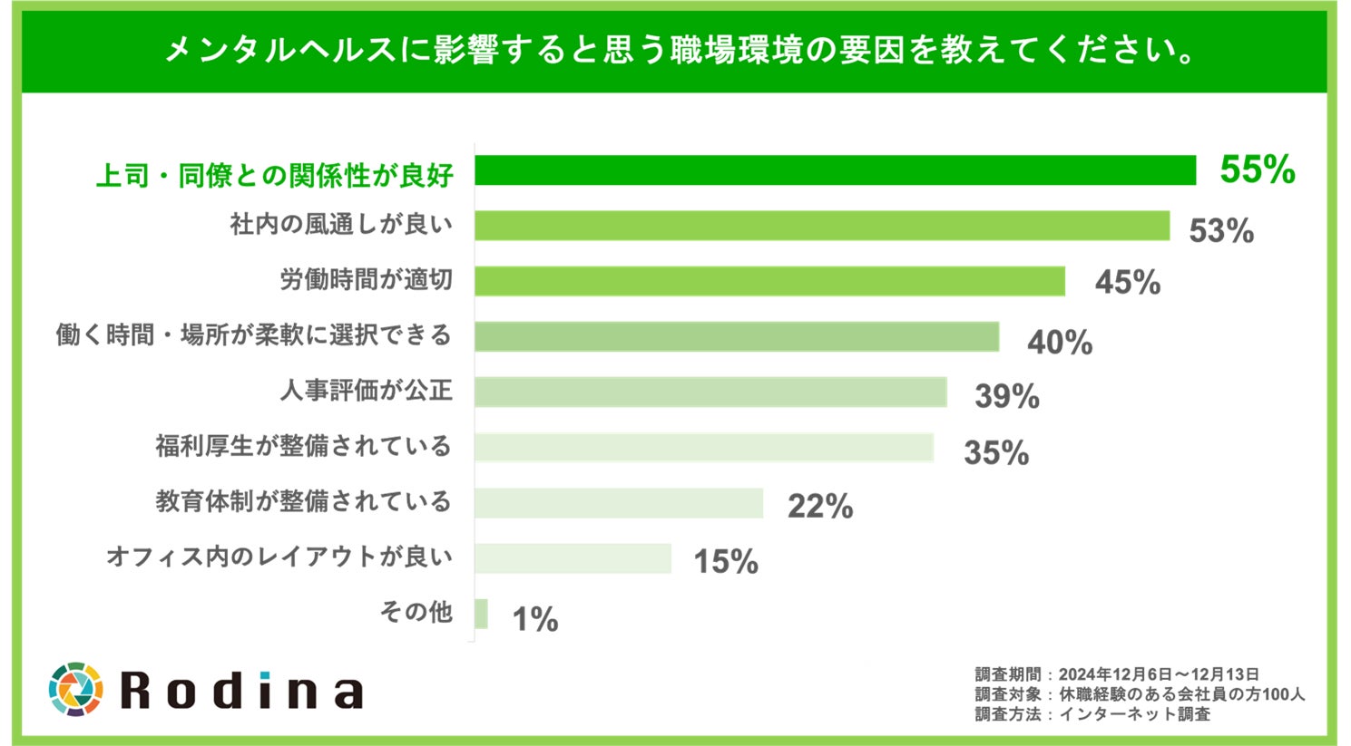 復職・就職を支援し、リワーク事業を展開する株式会社Rodina(本社:広島県広島市、代表取締役:山田 康輔)は、メンタルヘルスの不調により休職した経験のある、全国の20~60歳の会社員100名を対象とし、職場環境に関する調査を実施いたしました。