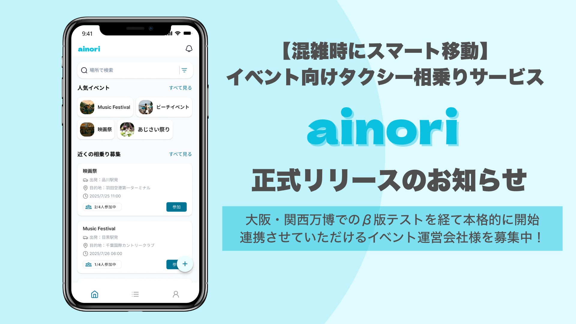 そこで私たちは、混雑しているエリアでスマートな移動を実現する手段として、タクシー相乗りマッチングサービス「ainori」を開始しました。同じイベントを楽しんだ仲間とタクシーをシェアすることで、金額も安心感も共有できる。そんな新しい移動の選択肢を全国のイベント参加者に届けていきます。