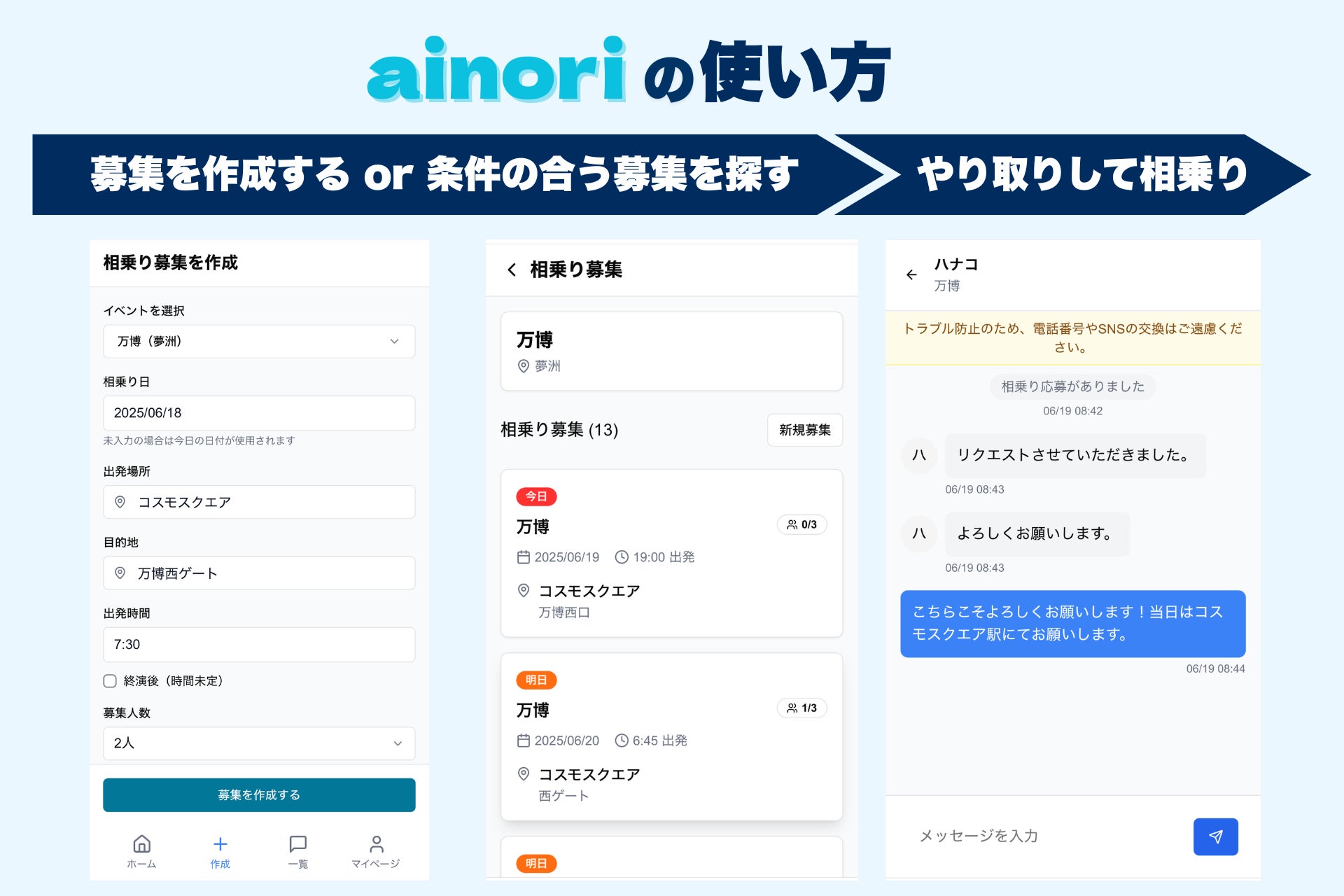 万博に行く際のシャトルバスが予約できず、移動手段を調べているときにainoriの存在を知りました。募集を投稿するとその日のうちにリクエストが届き、すぐに相乗りが決まりました。事前に年代や性別が分かるので安心感があり、当日はおすすめのパビリオン情報を共有しながら移動できたのも良かったです。