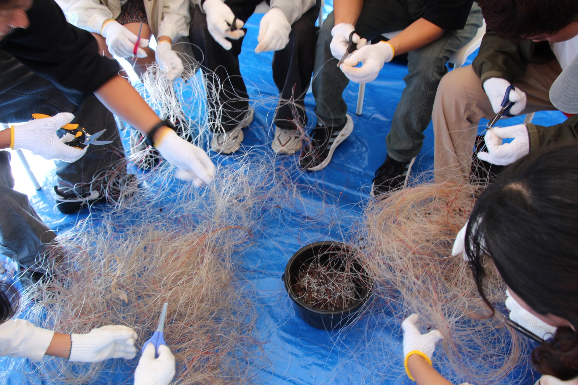海洋プラスチックゴミの問題は世界的にも問題視されており、廃漁網の海洋投棄は課題のひとつです。当社では5年前に廃漁網のリサイクルを事業化し、REAMIDEⓇとして高品質リサイクルナイロンペレットに再生しています。漁網をリサイクルするためには、針などの金属をハサミで一つひとつ取り除く作業が必要となります。