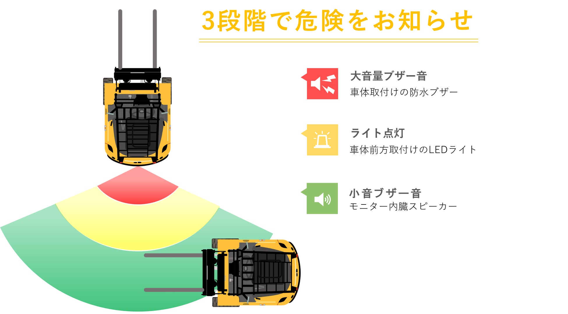 この新しいAIカメラシステムの最大のメリットは、段階を踏んでの警告が可能になる点です。 遠距離では小音での警告。中距離ではLEDでの視覚的警告。近距離では大音量のブザー警告。使用環境によってはLEDのみやブザーのみ様々な環境に対応します。従来のAIカメラでは、作業環境により音が鳴りすぎる等の問題がありましたが、LEDでの視覚的警告にすることにより、オぺーレーターのストレスを軽減します。これによって、本当に危険な際の警告が可能になります。主に作業者の対策や訓練に頼っていましたが、AIは人間の限界を補完し、無意識のミスや不注意による事故を防ぎます。また、作業環境の効率向上にも負けず、物流や生産現場でのスムーズな作業をサポートします。さらに、AI技術は学習能力を持つため、現場のデータを活かし続け、精度を高めていくことが期待されています。