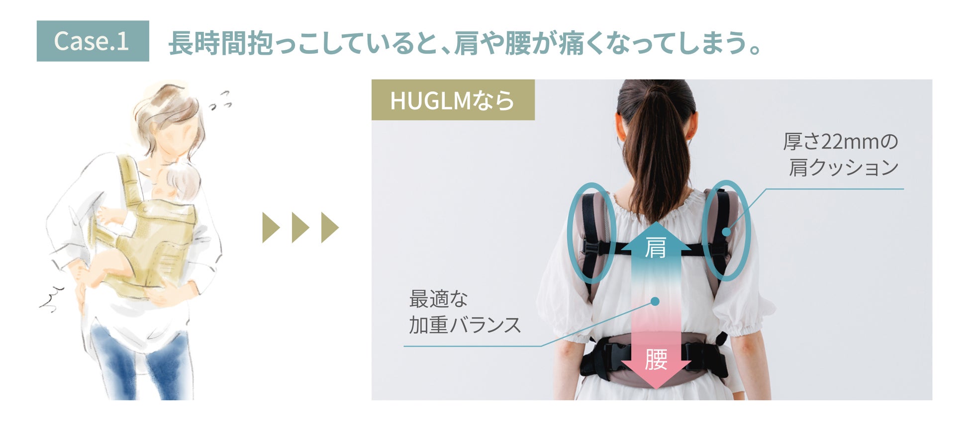 HUGLMなら肩に集中しがちな負担を腰へ分散し、荷重バランスを整えます。