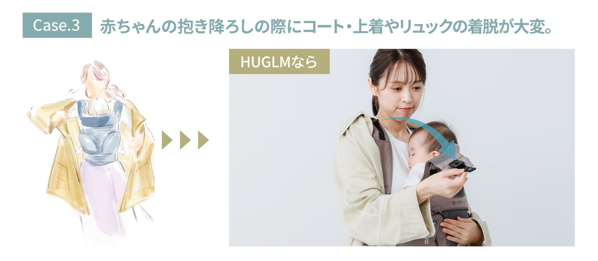 HUGLMならコートや上着を着たまま、リュックを背負ったまま、赤ちゃんの抱き降ろしができます。
