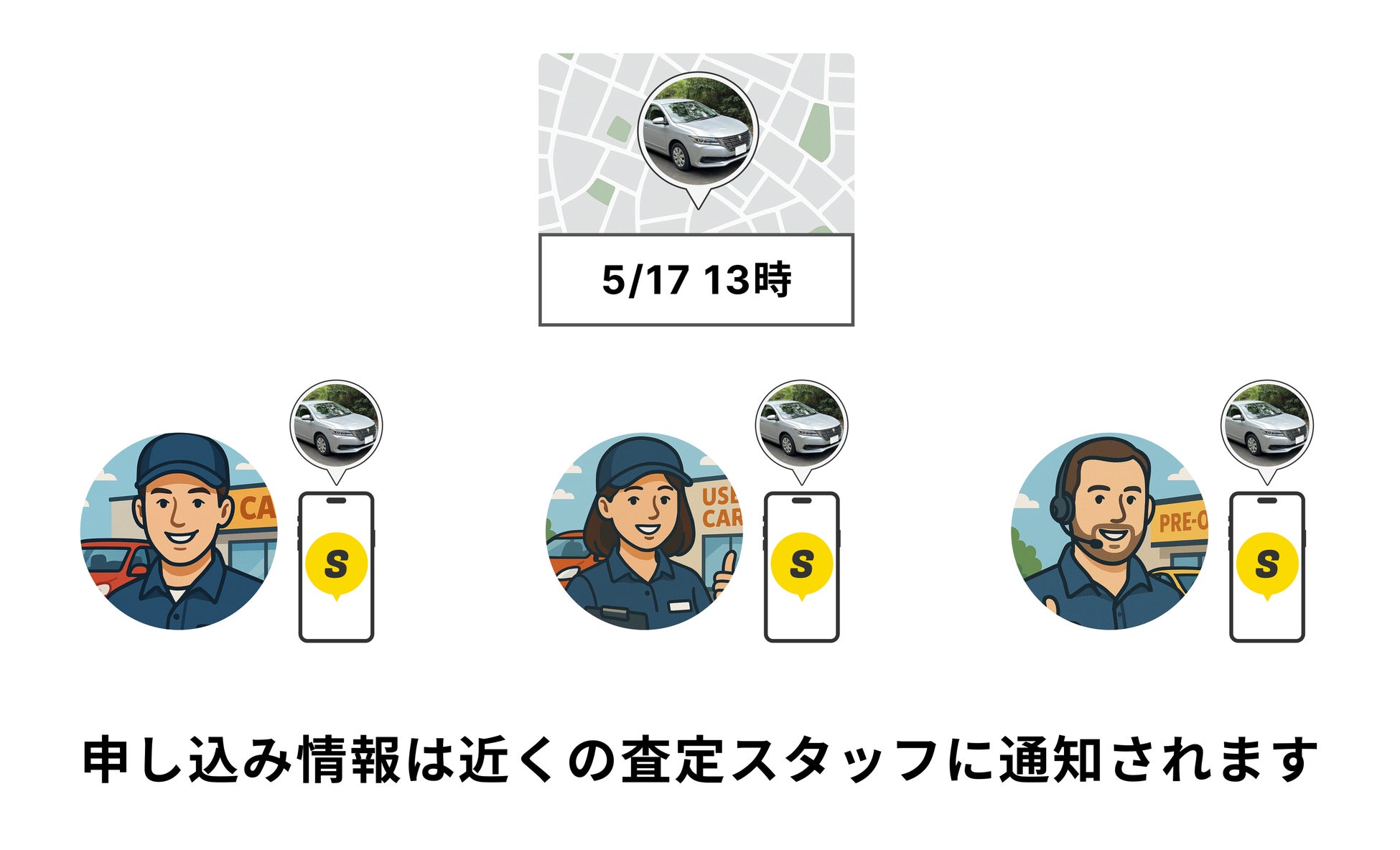 ユーザーは車両情報に加え、希望する査定日時・場所を設定するだけ。設定情報はストリマに登録している近隣査定スタッフへ通知され、査定を希望する店舗は指定場所へ直接向かいます。
