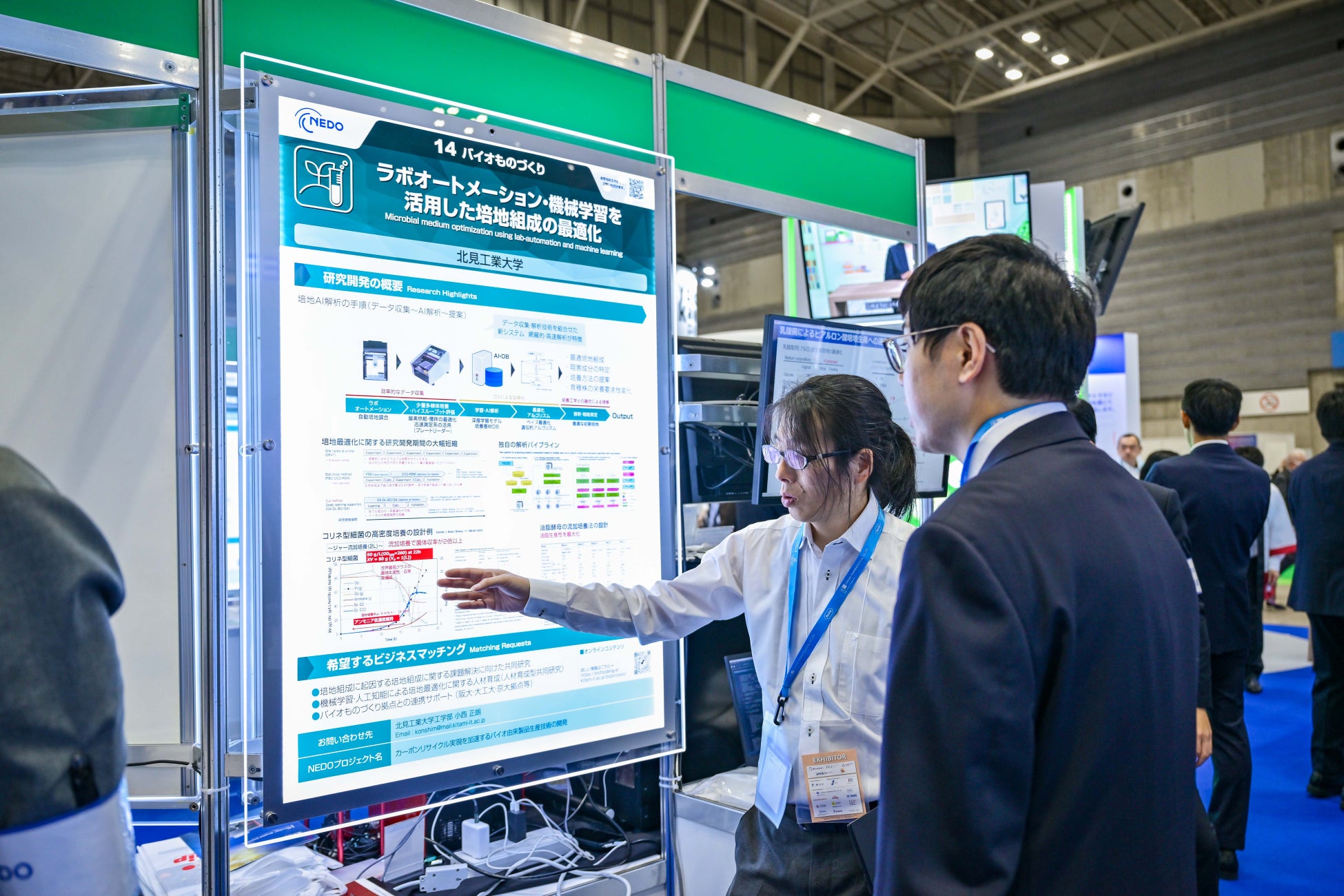 NEDOブースでは、「バイオものづくり」「燃料・エネルギー」「デジタル・ヘルスケア」の3つのカテゴリーの下、バイオ分野をけん引する33プロジェクトを公開。基盤研究からスケールアップまで至るバイオものづくり分野の最新の研究開発成果や、持続可能な航空燃料(SAF)をはじめとするバイオマス由来の燃料物質生産の取り組みなど、多様な展示を通じて、NEDOが手掛けるイノベーションに向けた取り組みを広く紹介しました。