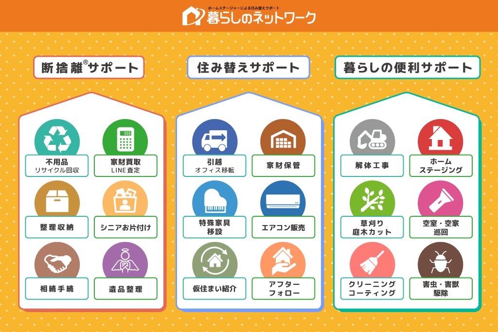 株式会社暮らしのネットワークは引越・断捨離🄬サービスを始め、家財保管、ハウスクリーニング、草刈り、害虫駆除等のお住み替えに伴う各種サービスをワンストップで提供する会社です。