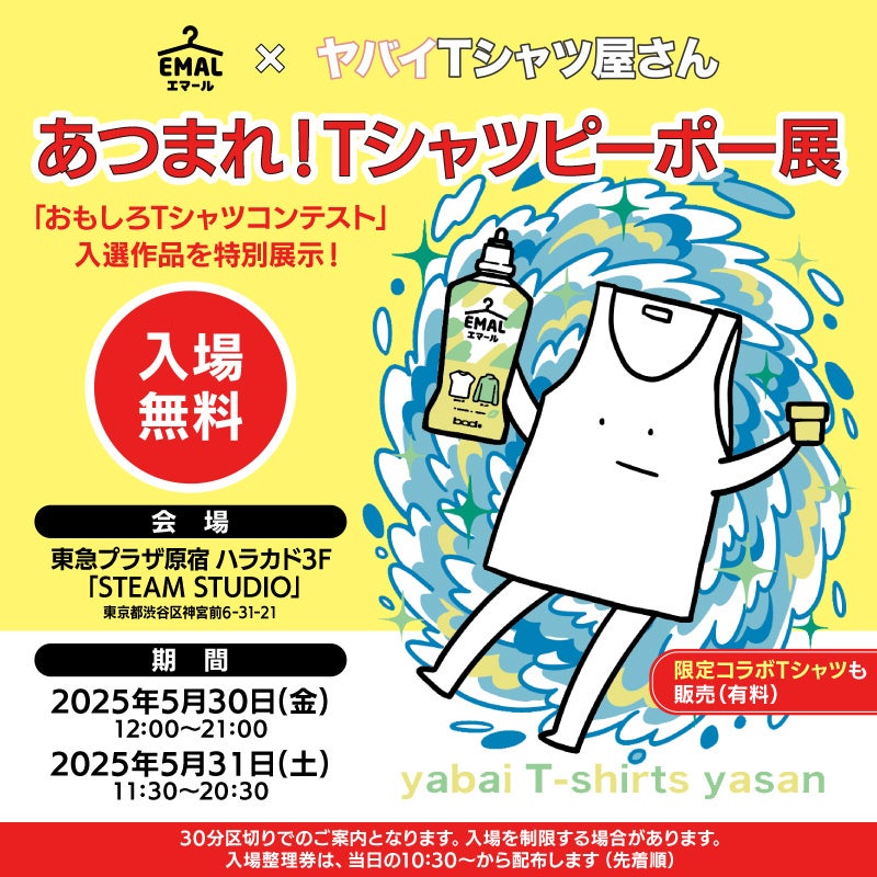 花王株式会社のおしゃれ着用洗剤「エマール」は、日本のスリーピースロックバンド・ヤバイTシャツ屋さんとコラボして2025年5月30日(金)31日(土)の2日間限定で、東急プラザ原宿 ハラカド3F「STEAM STUDIO」にて入場無料のPOPUPイベント「あつまれ!Tシャツピーポー展」を開催いたします。