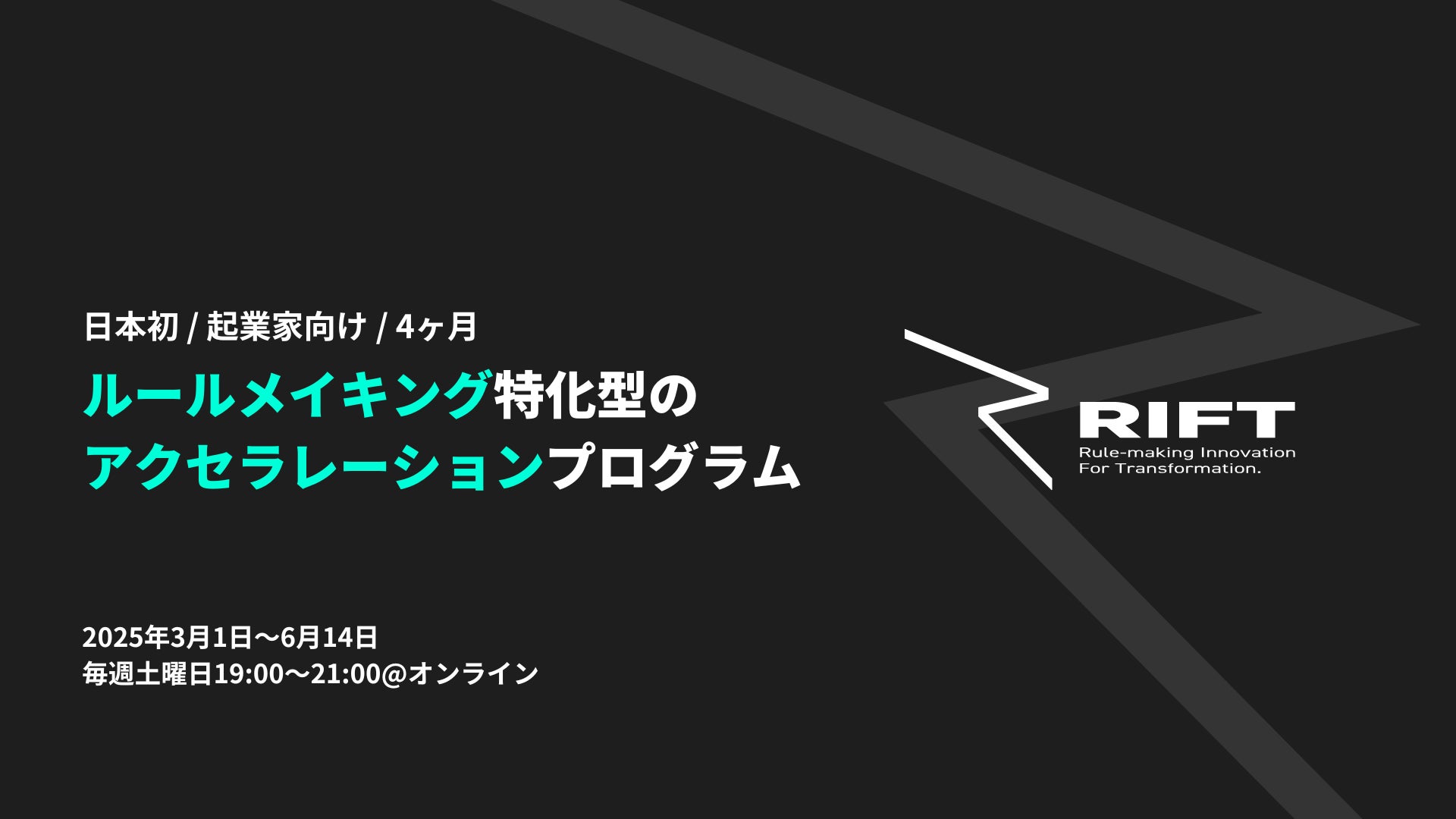 ルールメイキングアクセラレーションプログラム『RIFT』は、市場が未成熟な領域や、時代に合わなくなったルールの下で事業を立ち上げている起業家を対象に、事業成長や市場開拓を目指し、政策等の提言や業界ルールの整備などの”ルールメイキング”をサポートするプログラムです。
