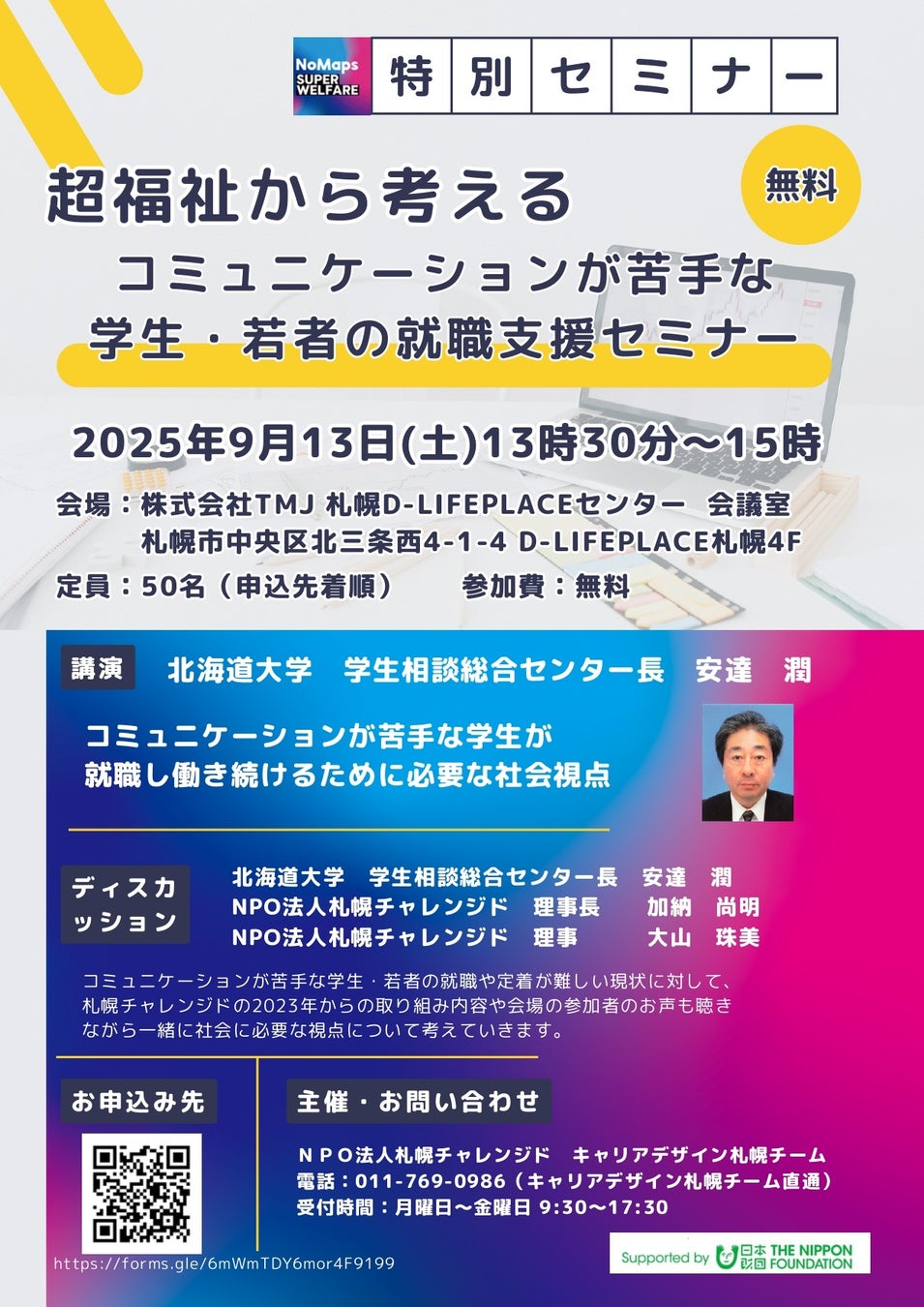 2年間の取り組みの成果を踏まえて、発達障がいのグレーゾーンと言われるコミュニ ケーションが苦手な学生・若者の就職に向けての現状・課題について議論します。 この課題は、札幌市だけではなく日本中の大学のある都市の共通の課題です。札幌か ら日本の重要な社会課題解決に挑戦していきます。