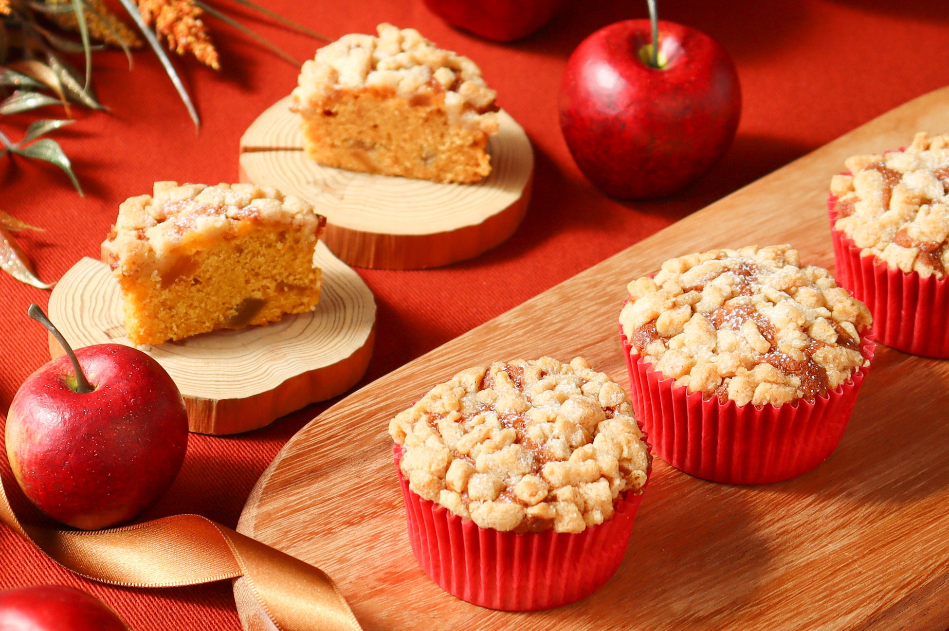 ふんわりとしたキャラメルパウンド生地に紅玉りんごのコンポートを混ぜ込んだケーキです。表面にはシナモンが香るシュトロイゼルを散りばめました。