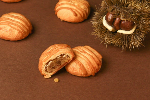 マロンのアーモンドクリームと栗の甘露煮をバターたっぷりの風味豊かなパイ生地で包み込み、モンブランに見立てて飾った栗の焼菓子です。