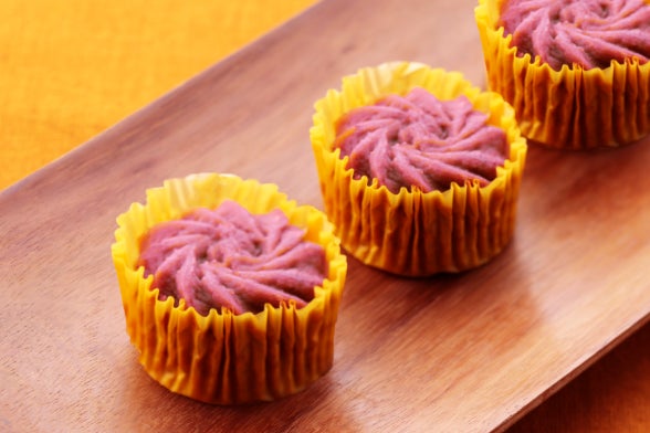鳴門金時芋に国産のむらさき芋を加え、しっとりとした食感できれいな紫色をした甘さ控えめのスイートポテトです。