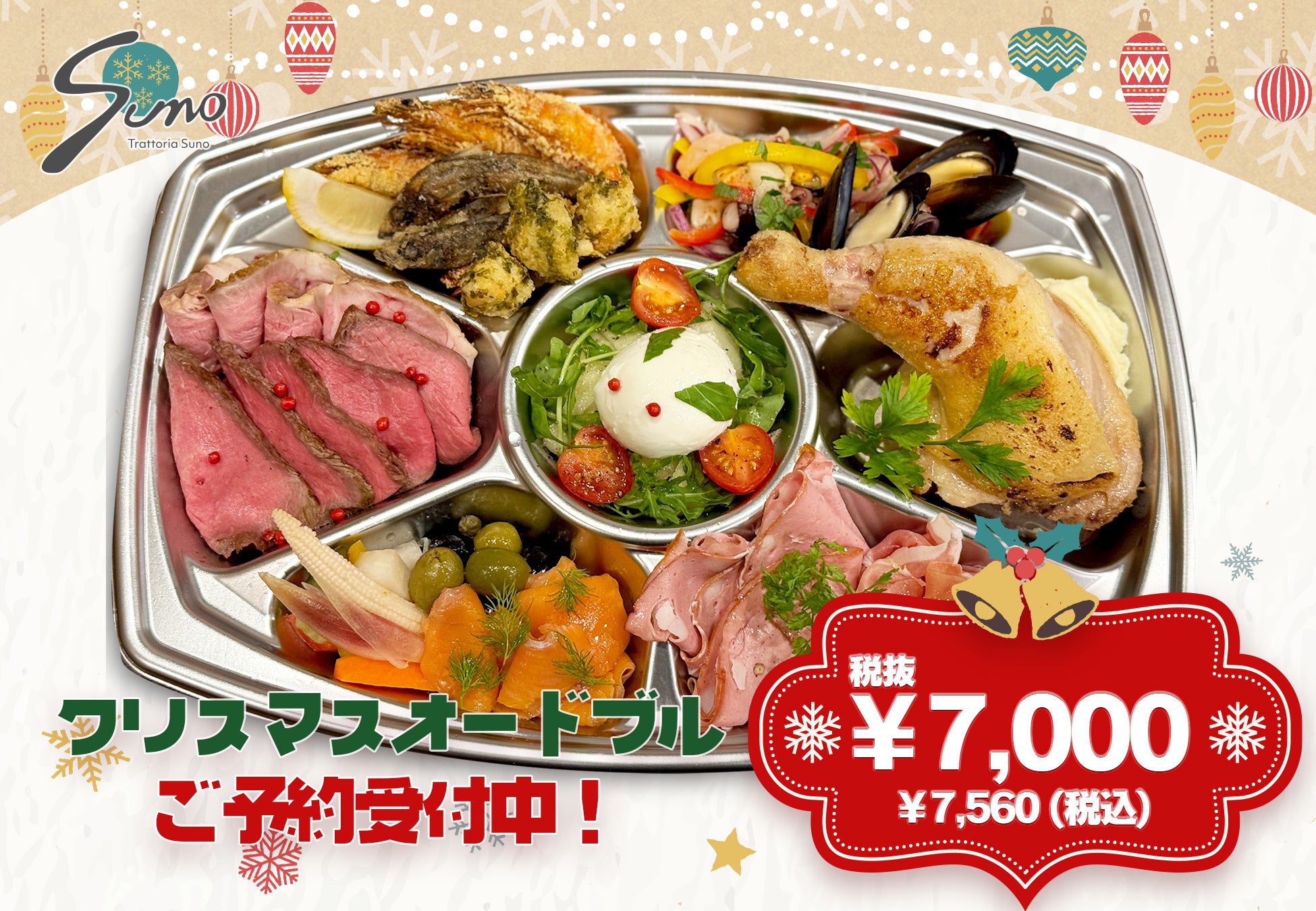 合同会社Suno(本社:中央区日本橋、代表社員:數納拓也)が運営するカジュアルイタリアン・レストラン『Trattoria Suno (トラットリア スノウ)』にてクリスマスオードブルのご予約を開始いたします。
